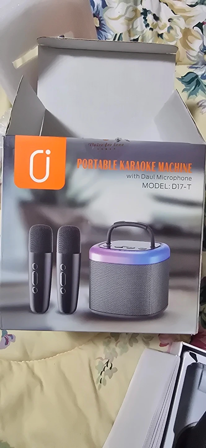 This portable karaoke machine comes with two microphones. It features a handle for easy carrying and colourful LED lights around the speaker. The package includes the karaoke speaker and two microphones.