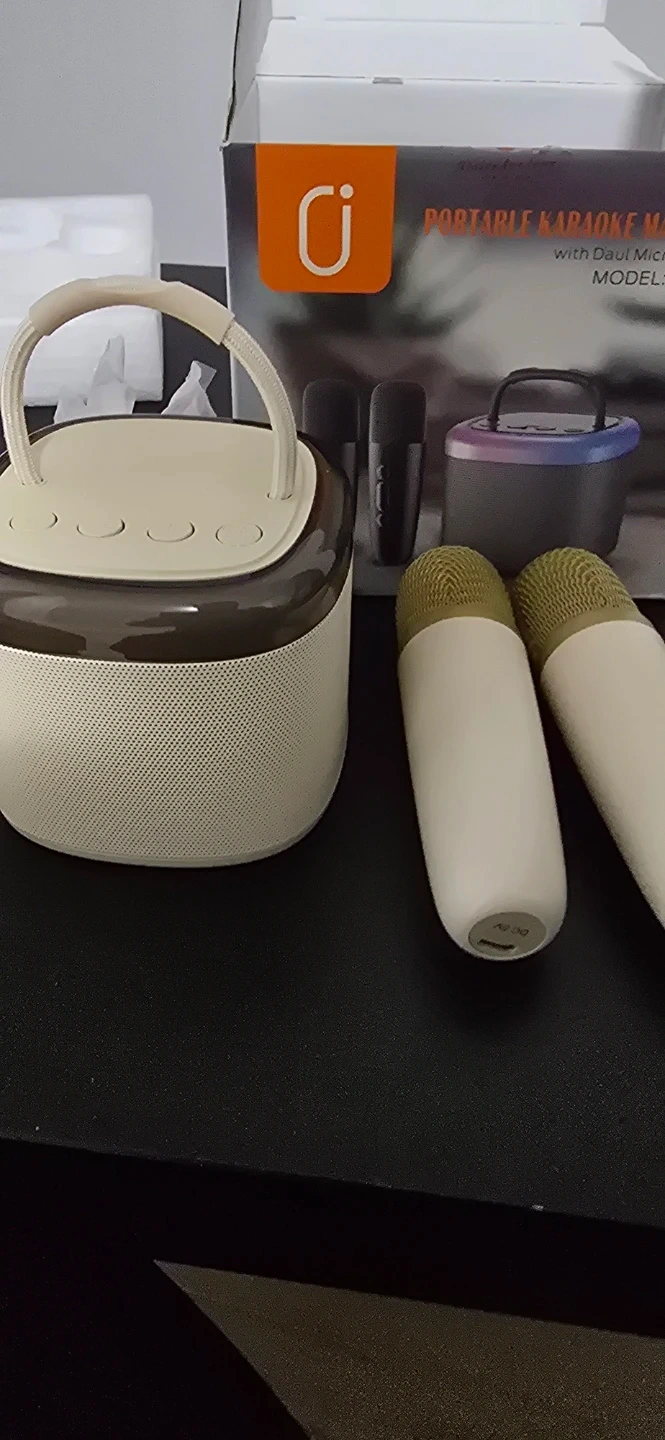 This portable karaoke machine comes with two microphones. It features a handle for easy carrying and colourful LED lights around the speaker. The package includes the karaoke speaker and two microphones.