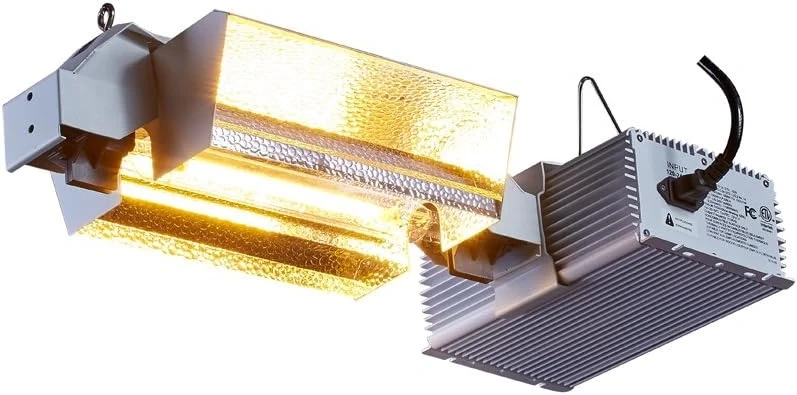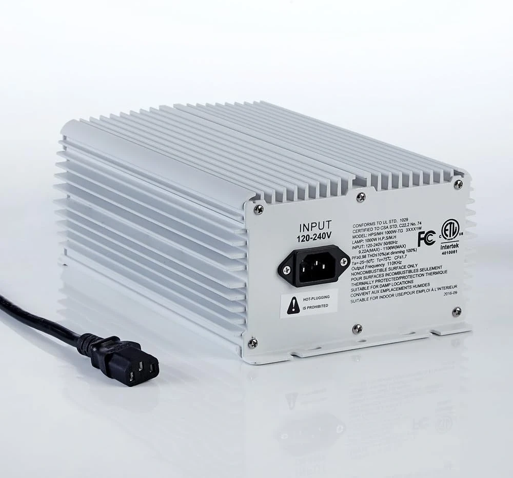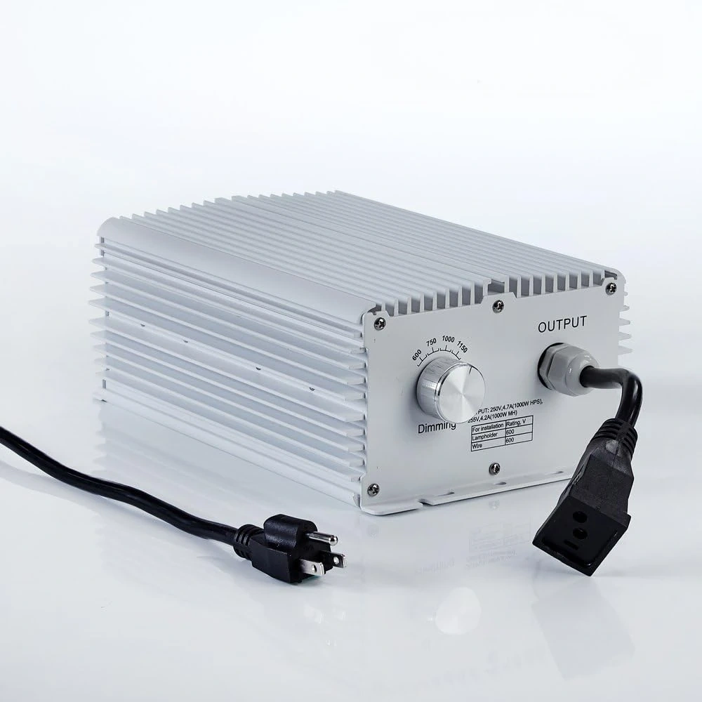 This dimmable ballast is designed for 1000W HPS/MH lamps. It supports input voltages from 120-240V. The unit features a dimming dial for adjusting light output. It's built with a durable aluminum housing for heat dissipation.