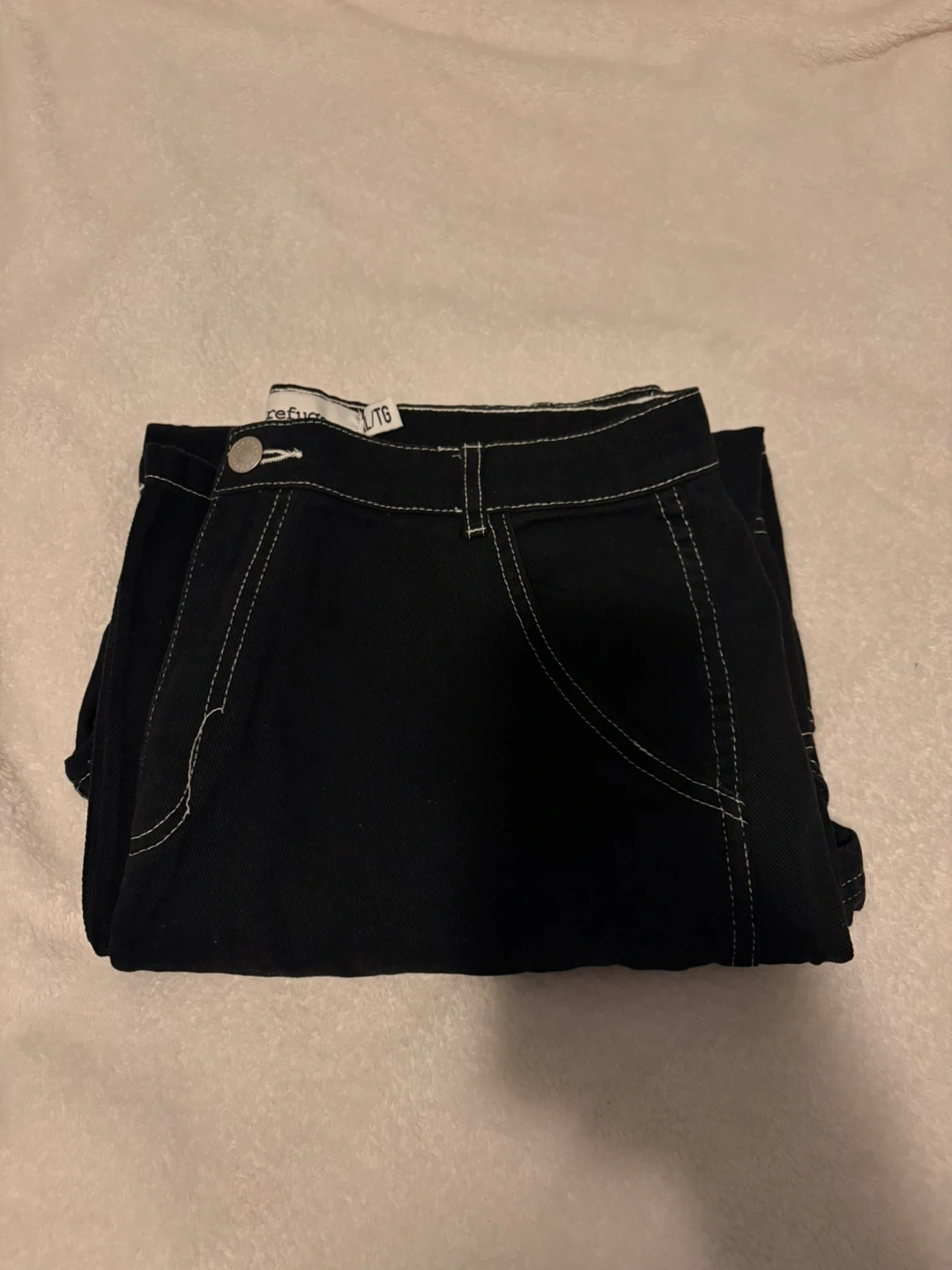 Black cargo pants from Refuge. Features contrast stitching and a comfortable fit. Made in Bangladesh. Size XL/TG.