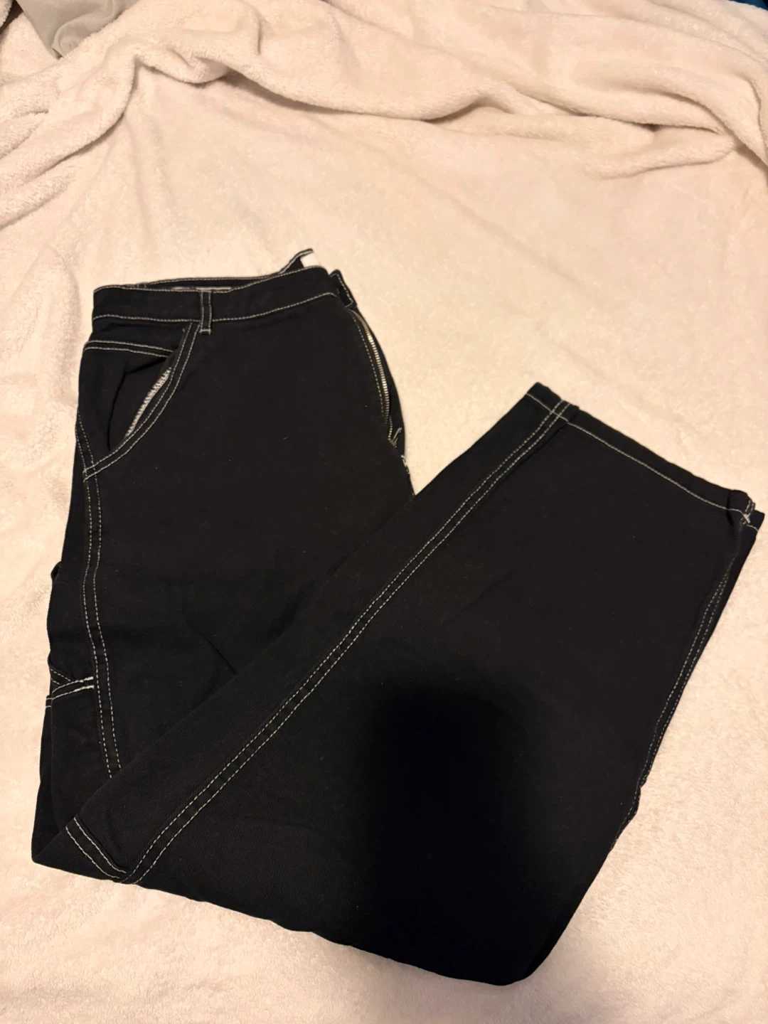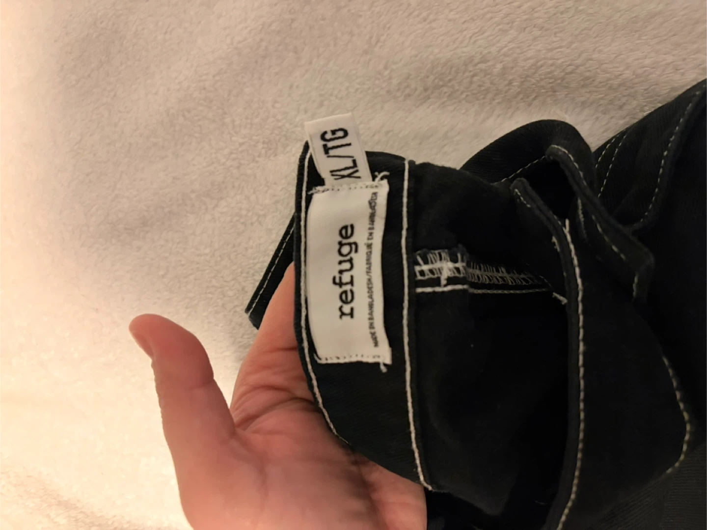Black cargo pants from Refuge. Features contrast stitching and a comfortable fit. Made in Bangladesh. Size XL/TG.