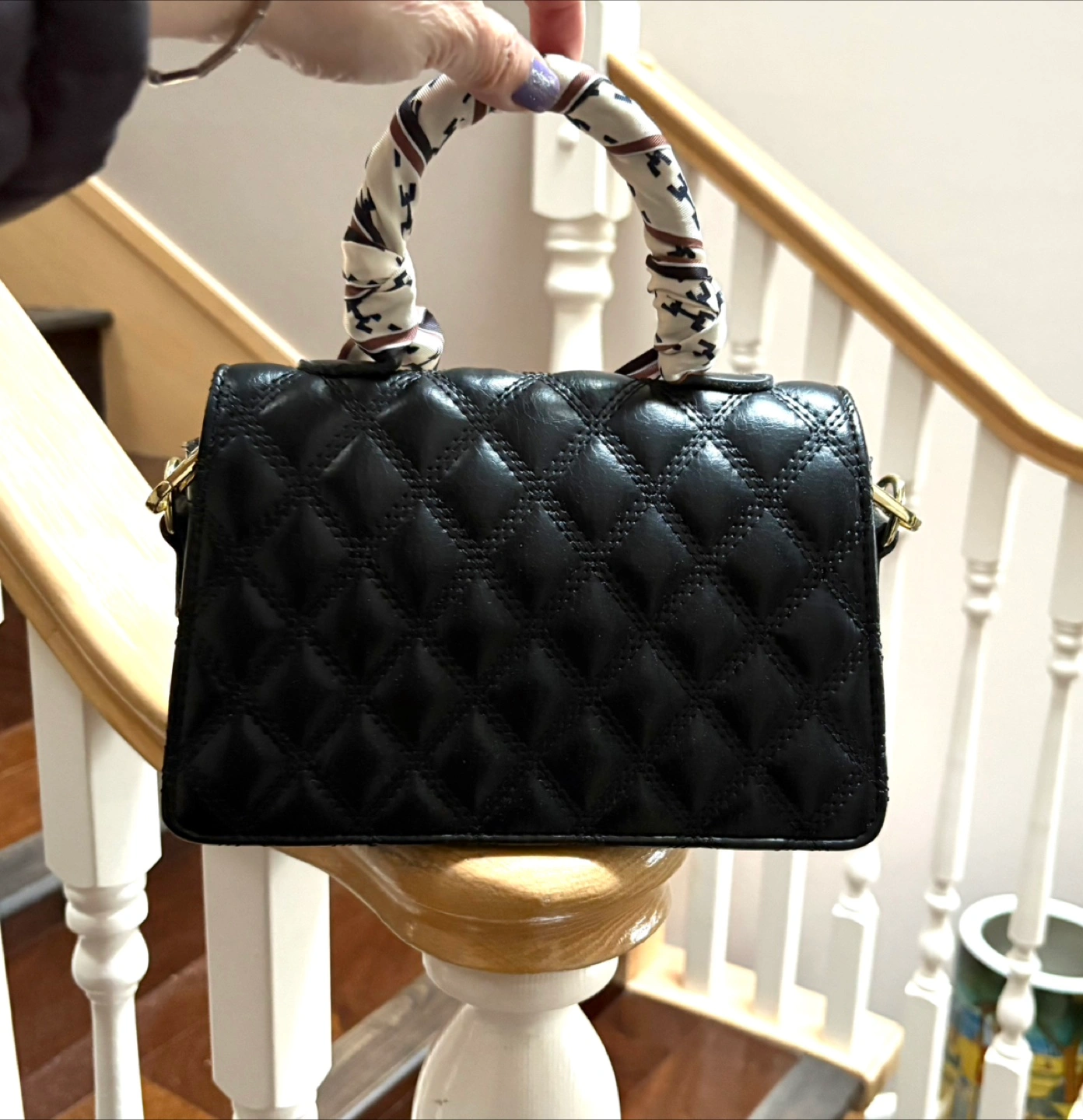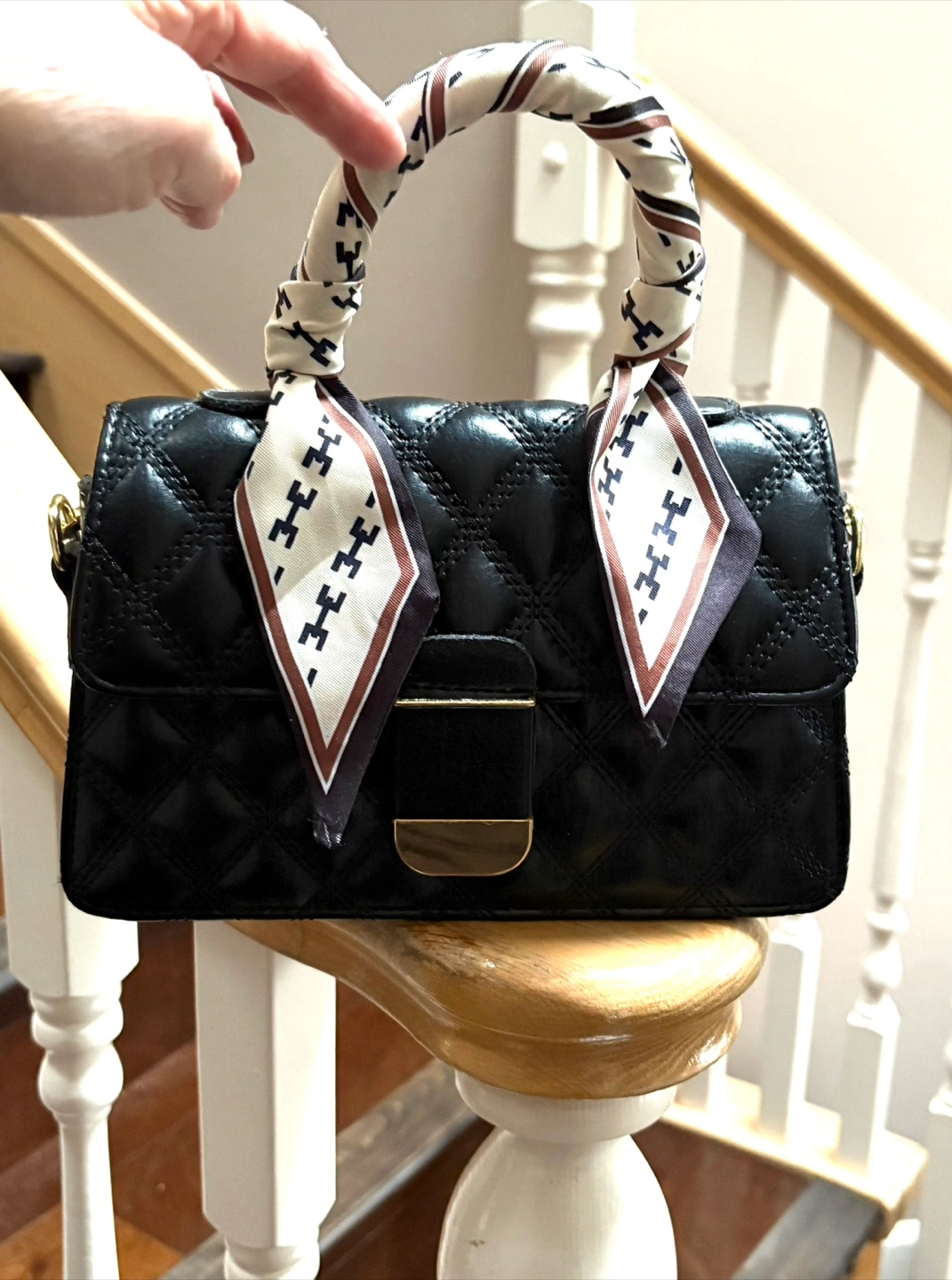Stylish black quilted handbag with a decorative scarf wrapped around the handle.