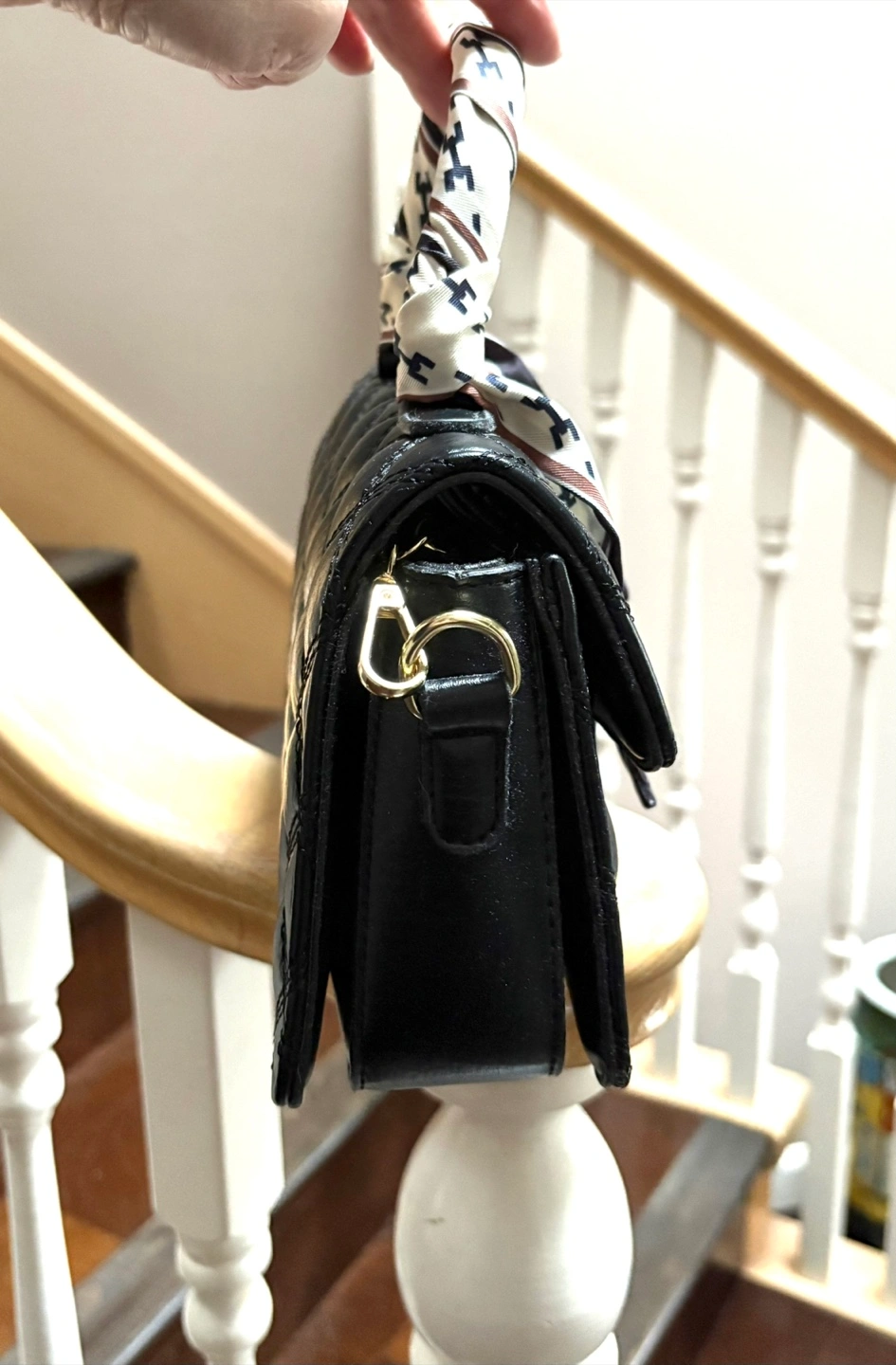 Stylish black quilted handbag with a decorative scarf wrapped around the handle.