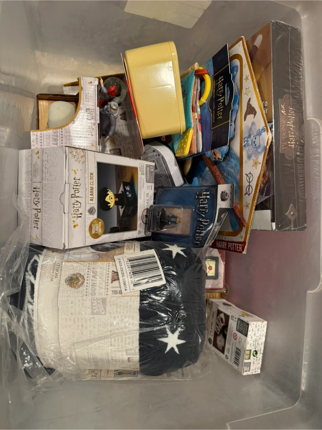 We have a blanket, metal earth kit, soup cup with lid, wallet, figurines, furry hedwig, Harry Potter alarm clock, Pictionary game, playing cards and more.