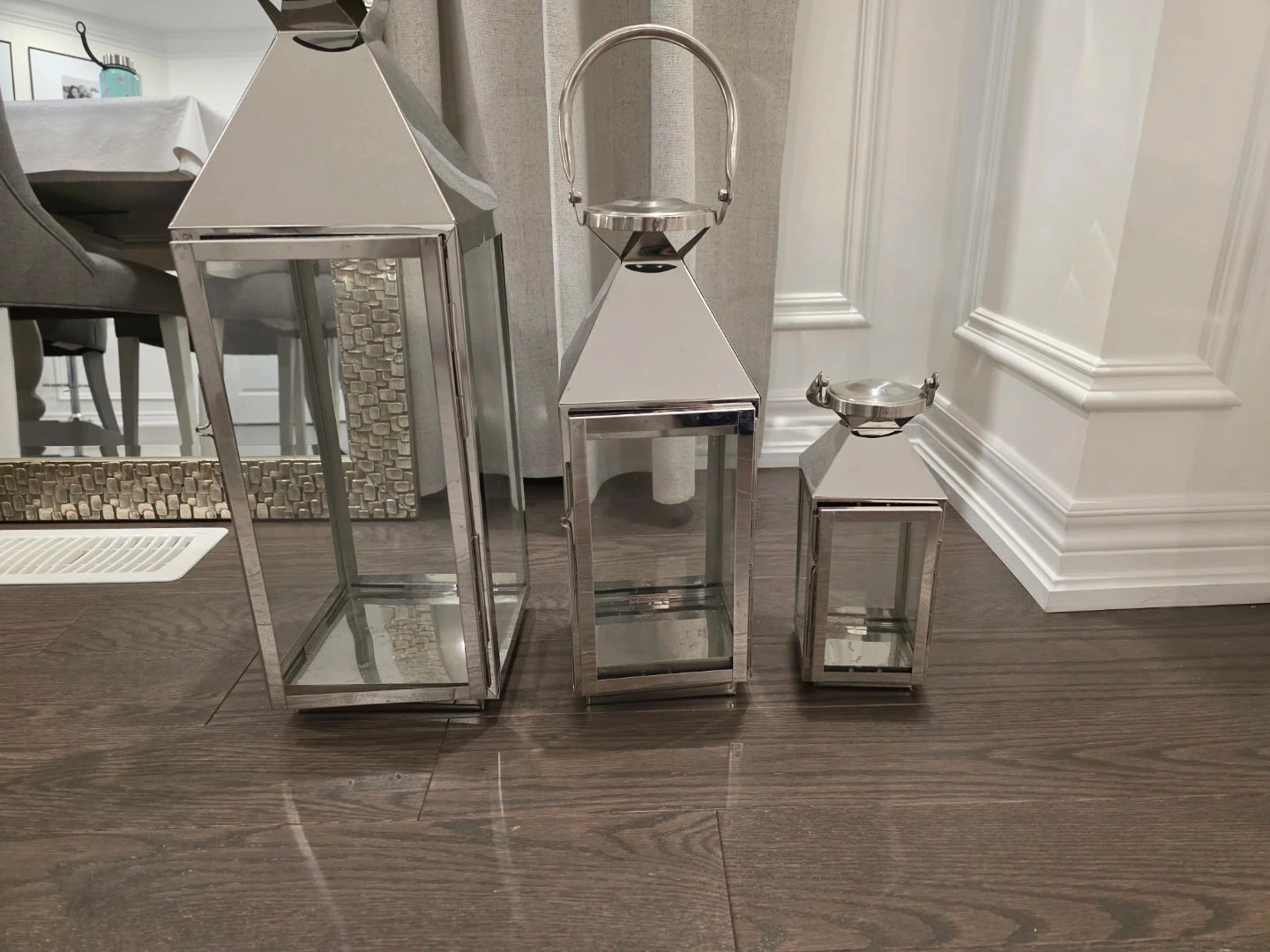 Selling a set of three silver metal lanterns with glass panels. They come in various sizes, perfect for adding a touch of elegance to your home decor. These lanterns would look lovely on a mantelpiece or as part of a centrepiece arrangement.