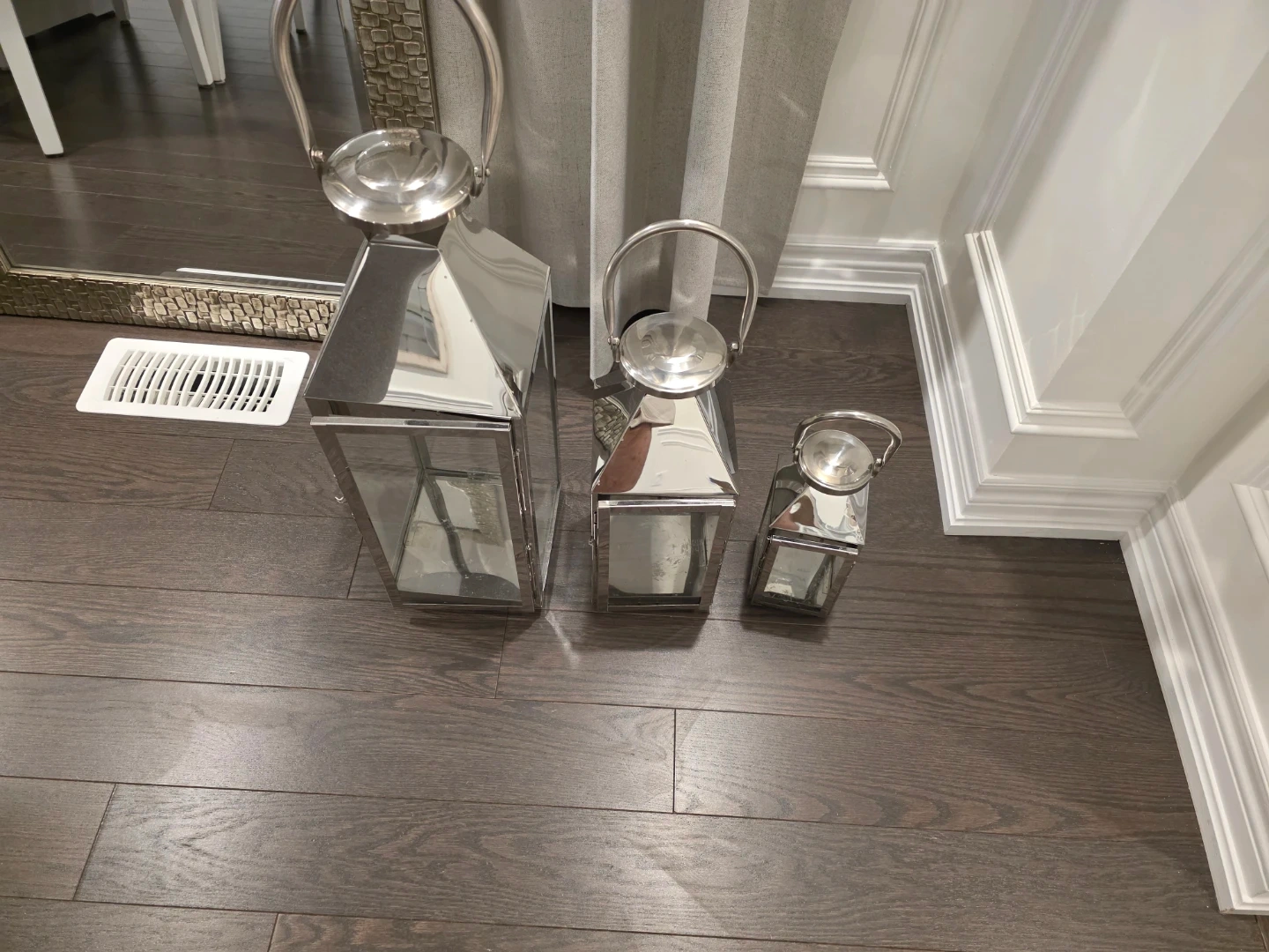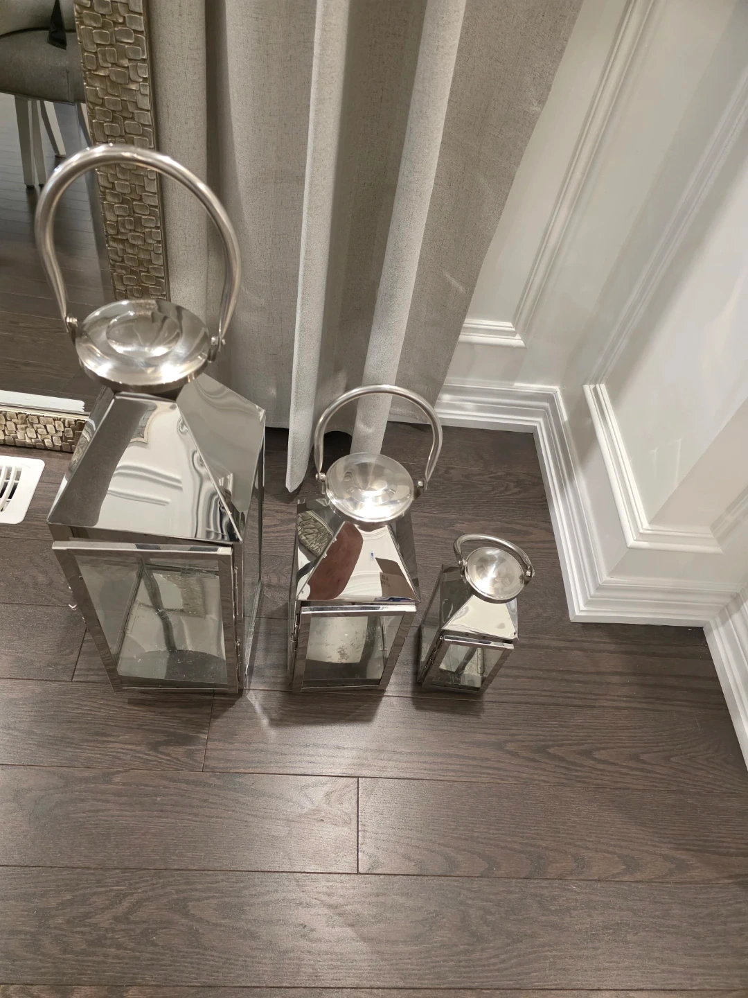 Selling a set of three silver metal lanterns with glass panels. They come in various sizes, perfect for adding a touch of elegance to your home decor. These lanterns would look lovely on a mantelpiece or as part of a centrepiece arrangement.