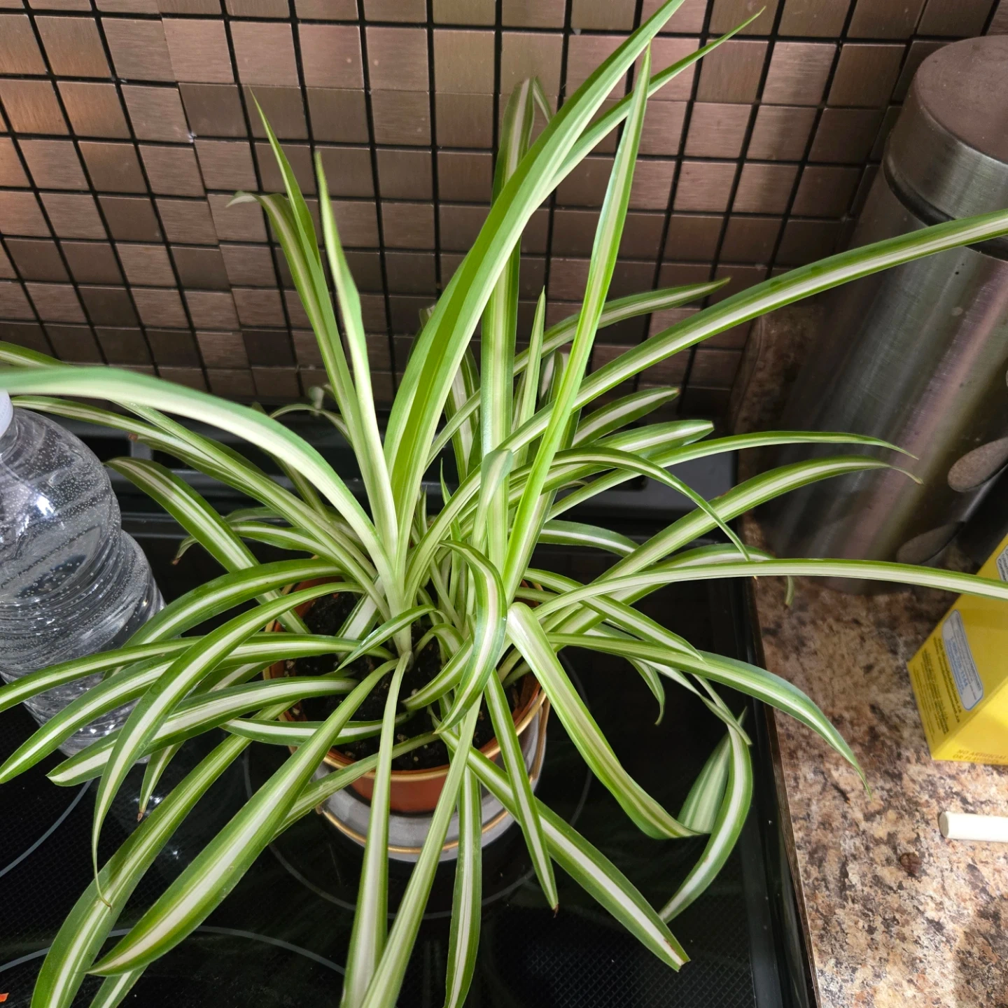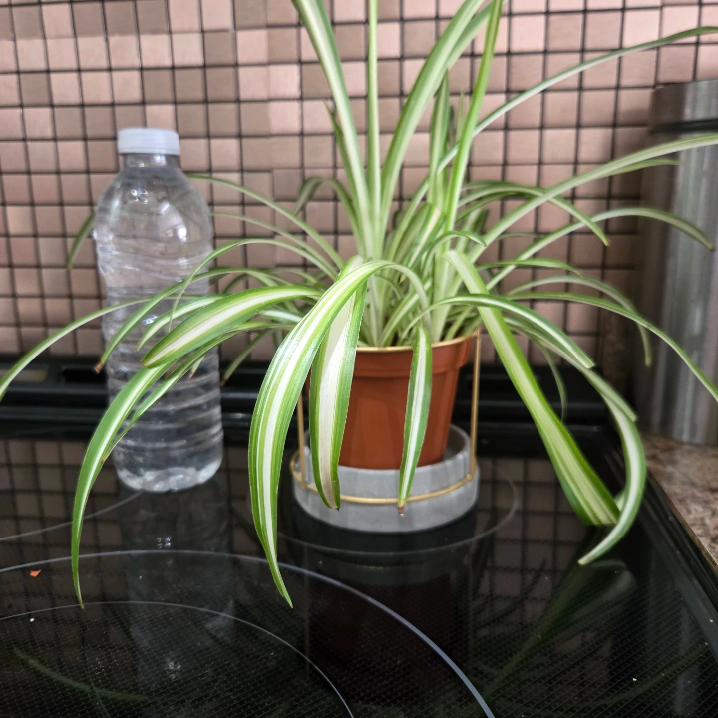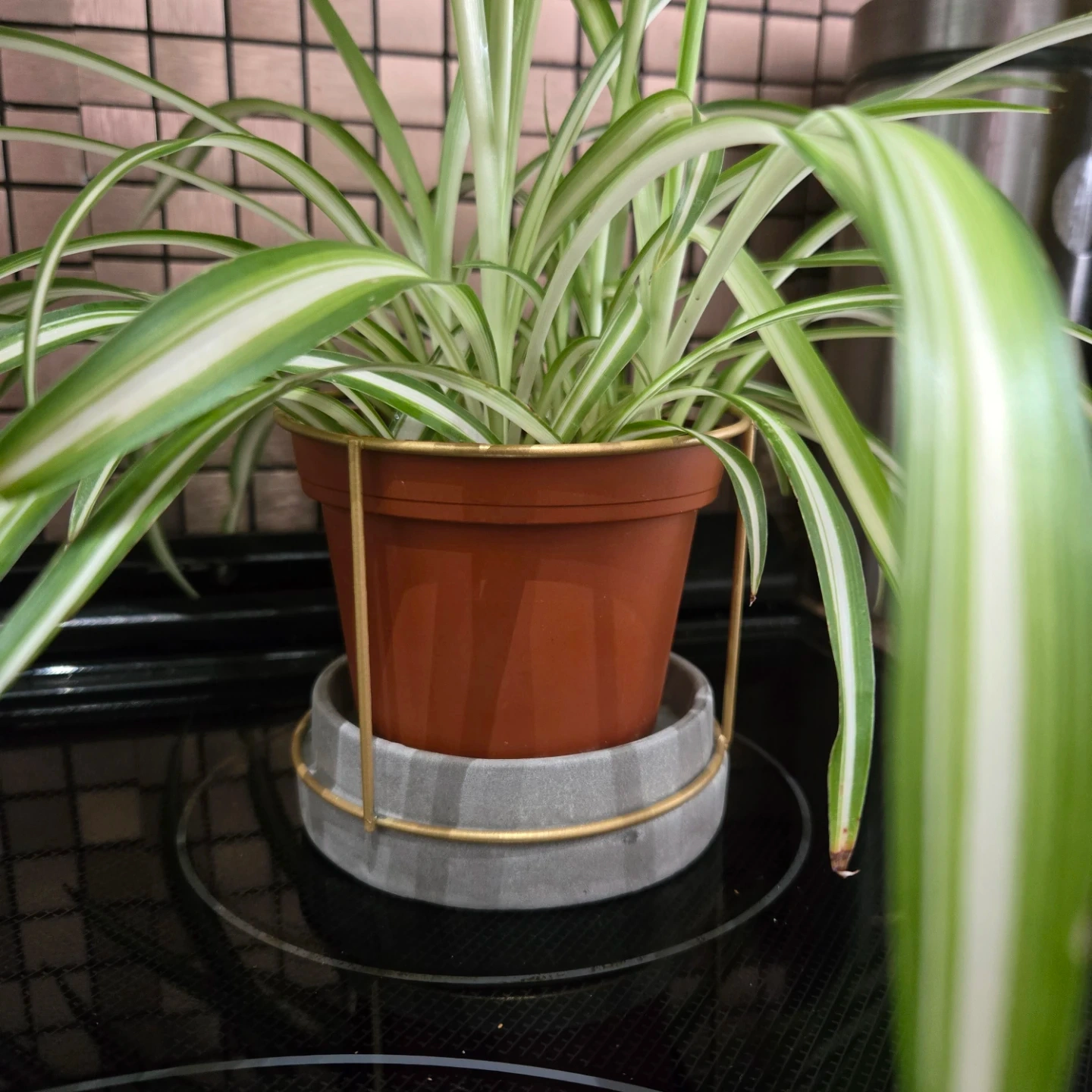 This is a healthy spider plant with its characteristic green and white striped leaves. It's planted in a brown plastic pot with a grey concrete planter and gold accent stand. This plant is known for being easy to care for and can add a touch of greenery to any space.