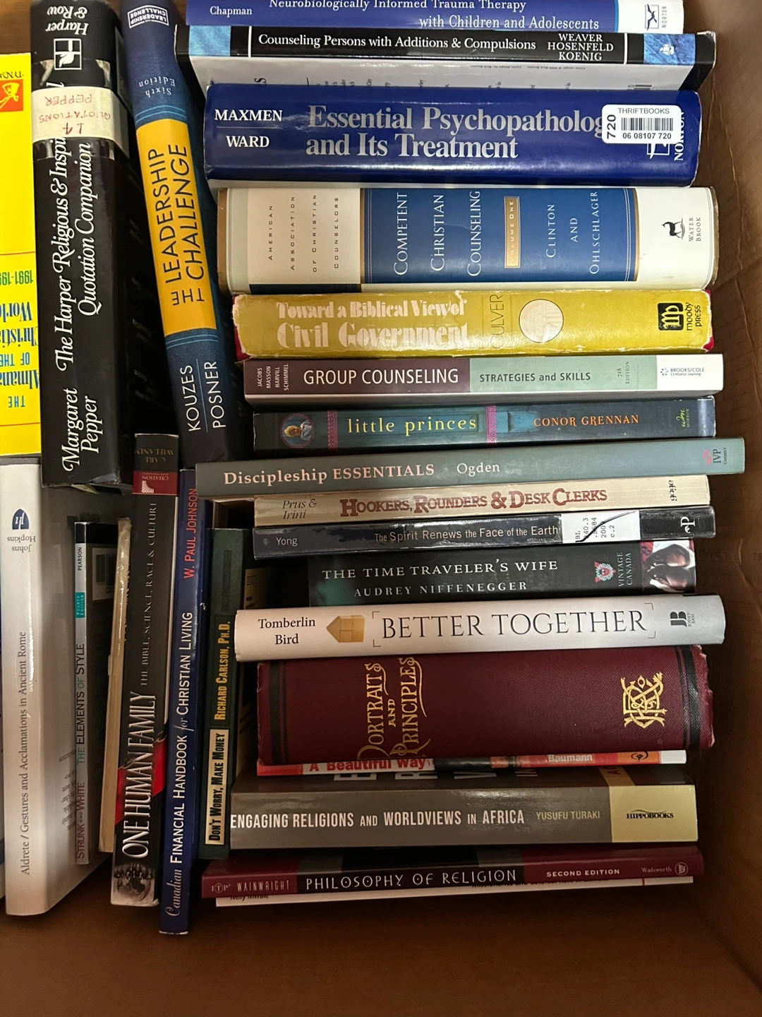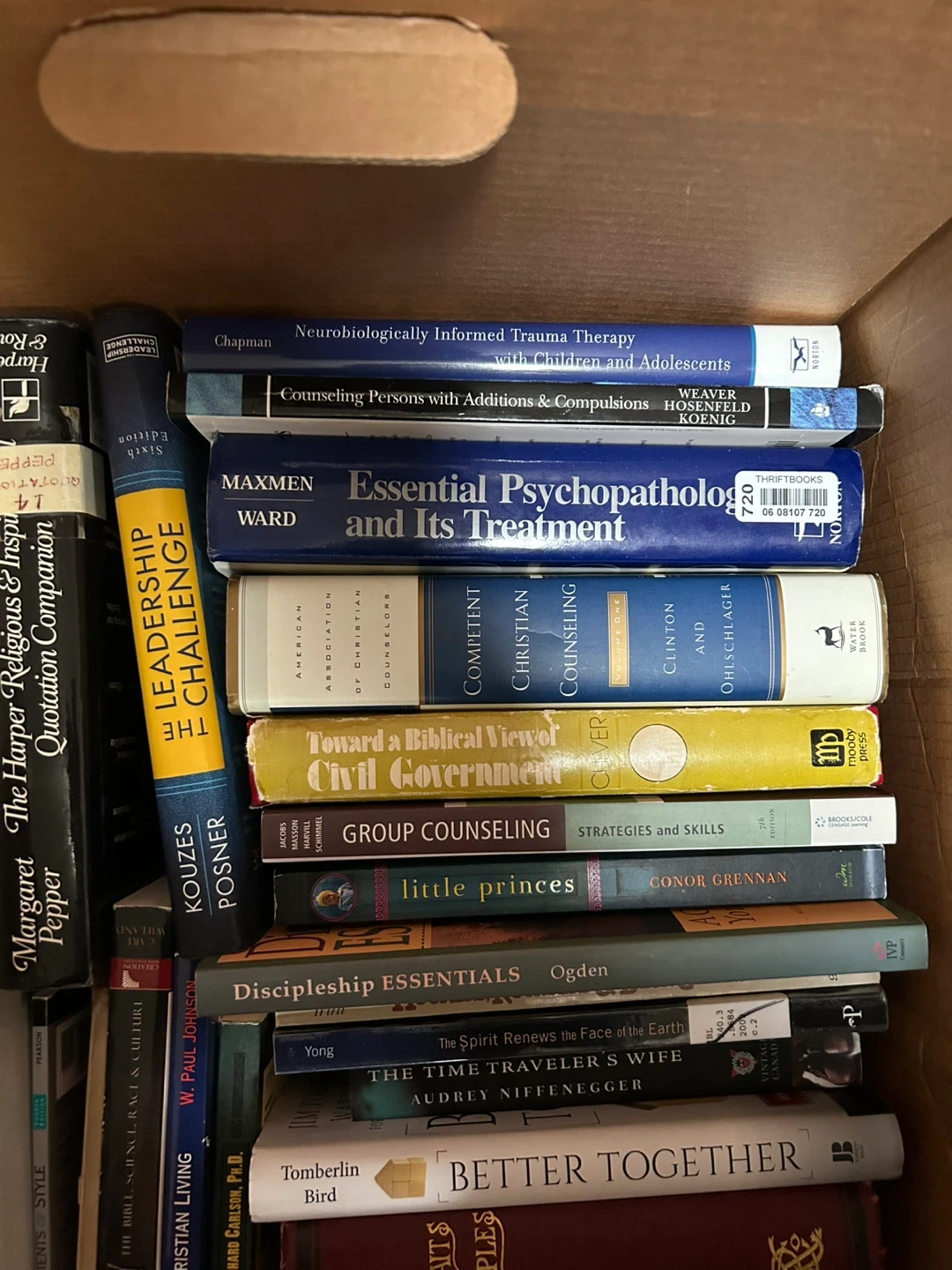 This lot includes various books on topics like Christian counseling, psychology, and worldviews. Titles cover subjects such as trauma therapy, addiction treatment, and leadership. A great collection for those interested in personal growth and theological studies.