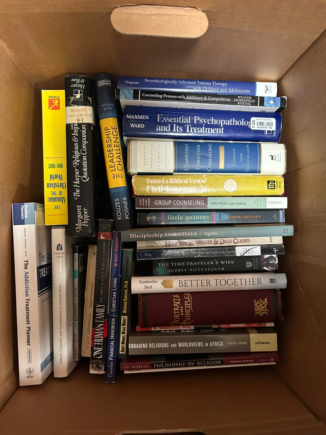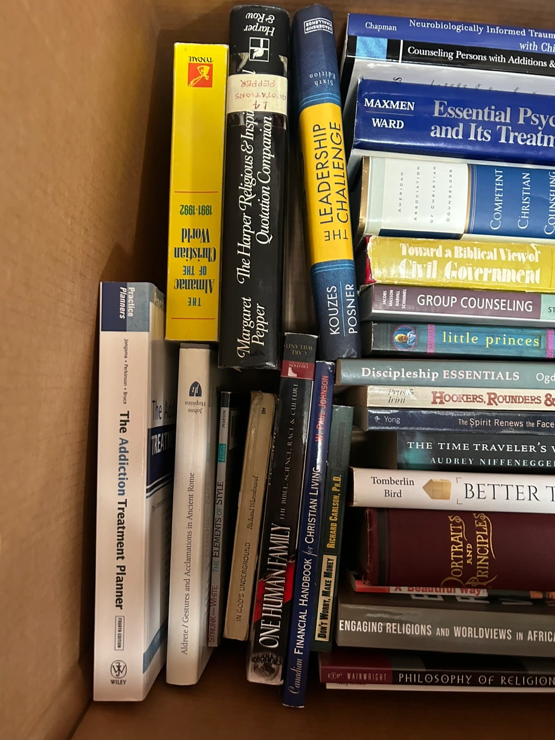 This lot includes various books on topics like Christian counseling, psychology, and worldviews. Titles cover subjects such as trauma therapy, addiction treatment, and leadership. A great collection for those interested in personal growth and theological studies.