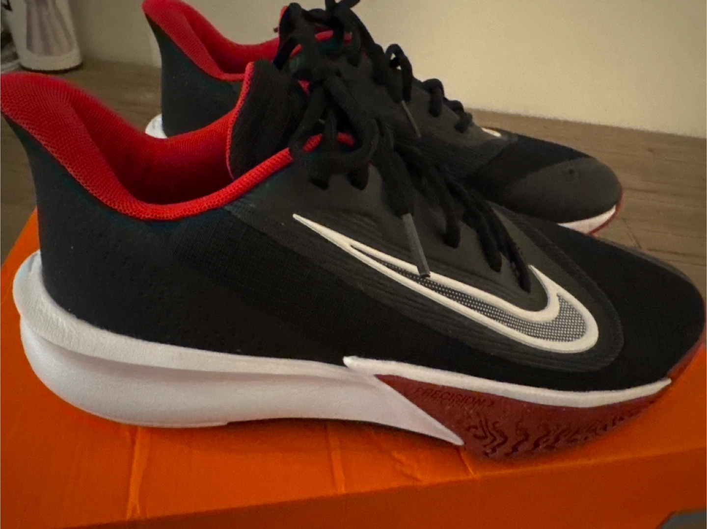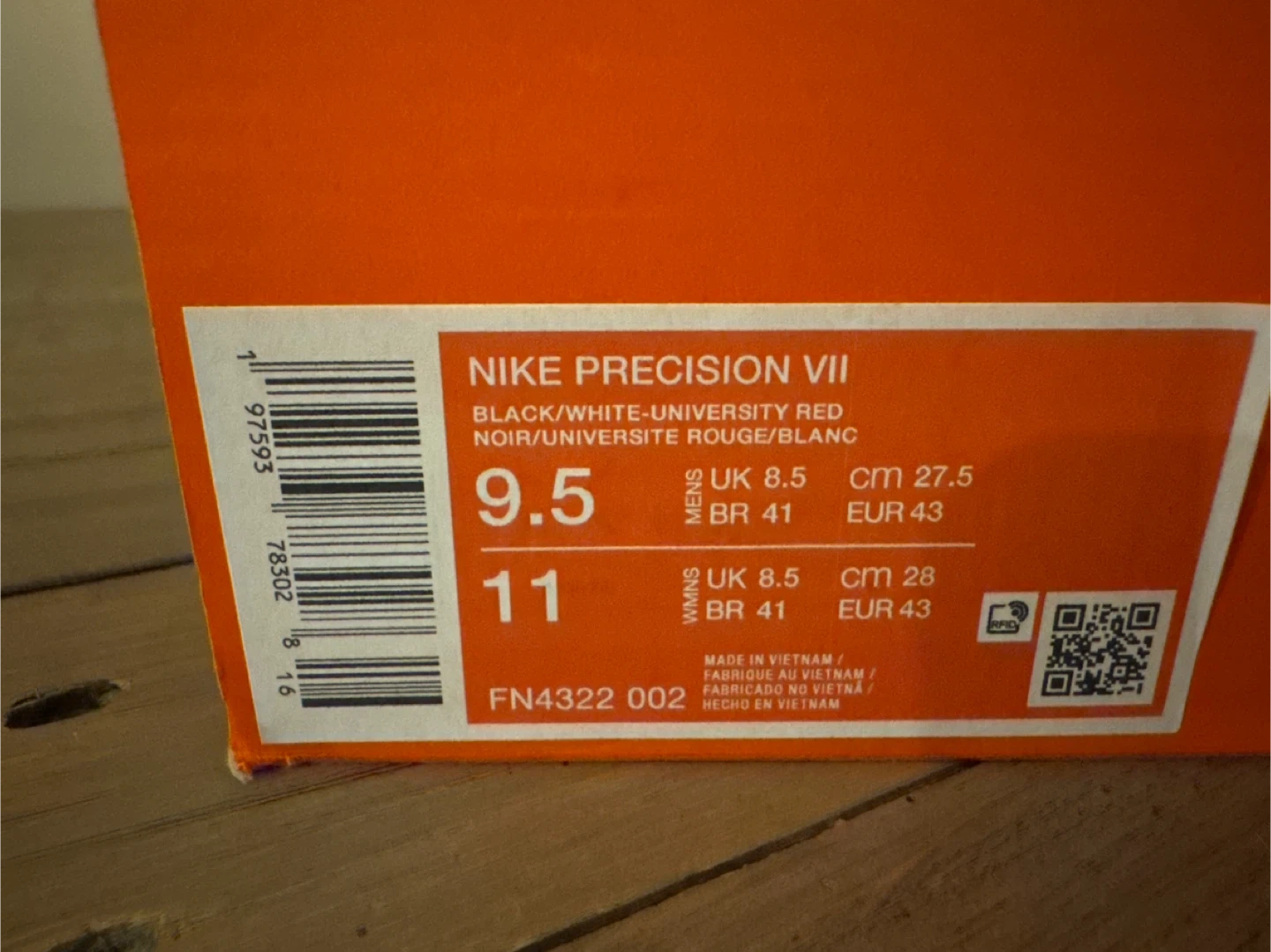 These are Nike Precision VII basketball shoes in black, white, and university red. They're a men's size 9.5 (UK 8.5, EUR 43). Includes the original box. These shoes are designed for performance on the court!