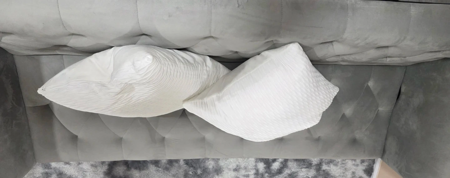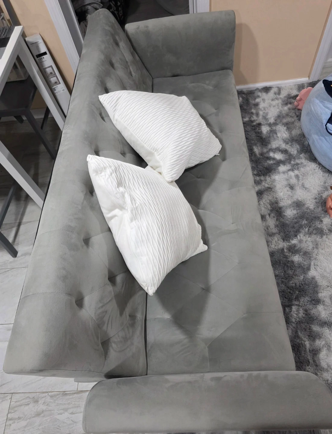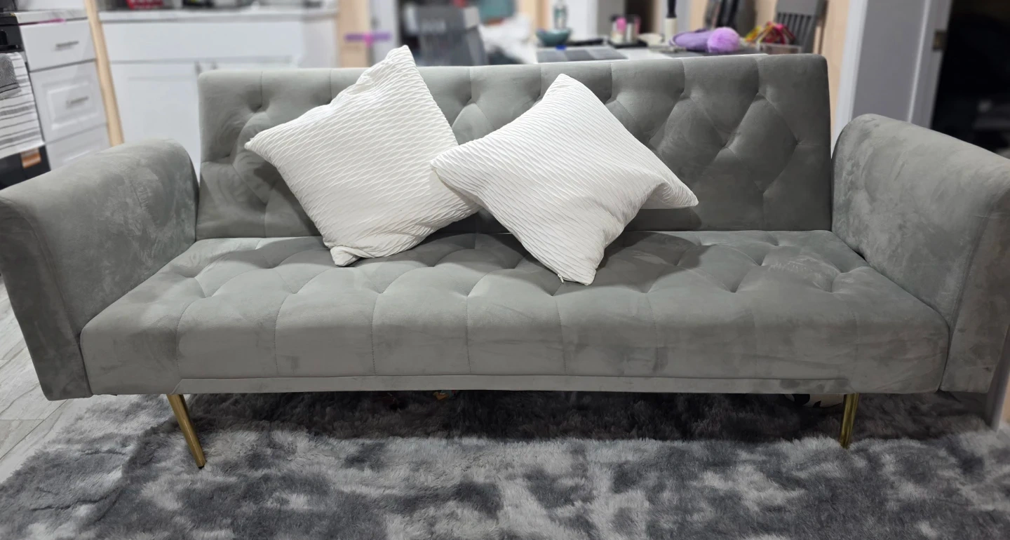 Sofa cama futón en terciopelo color gris, con diseño capitone y patas de metal doradas. 3 meses de uso