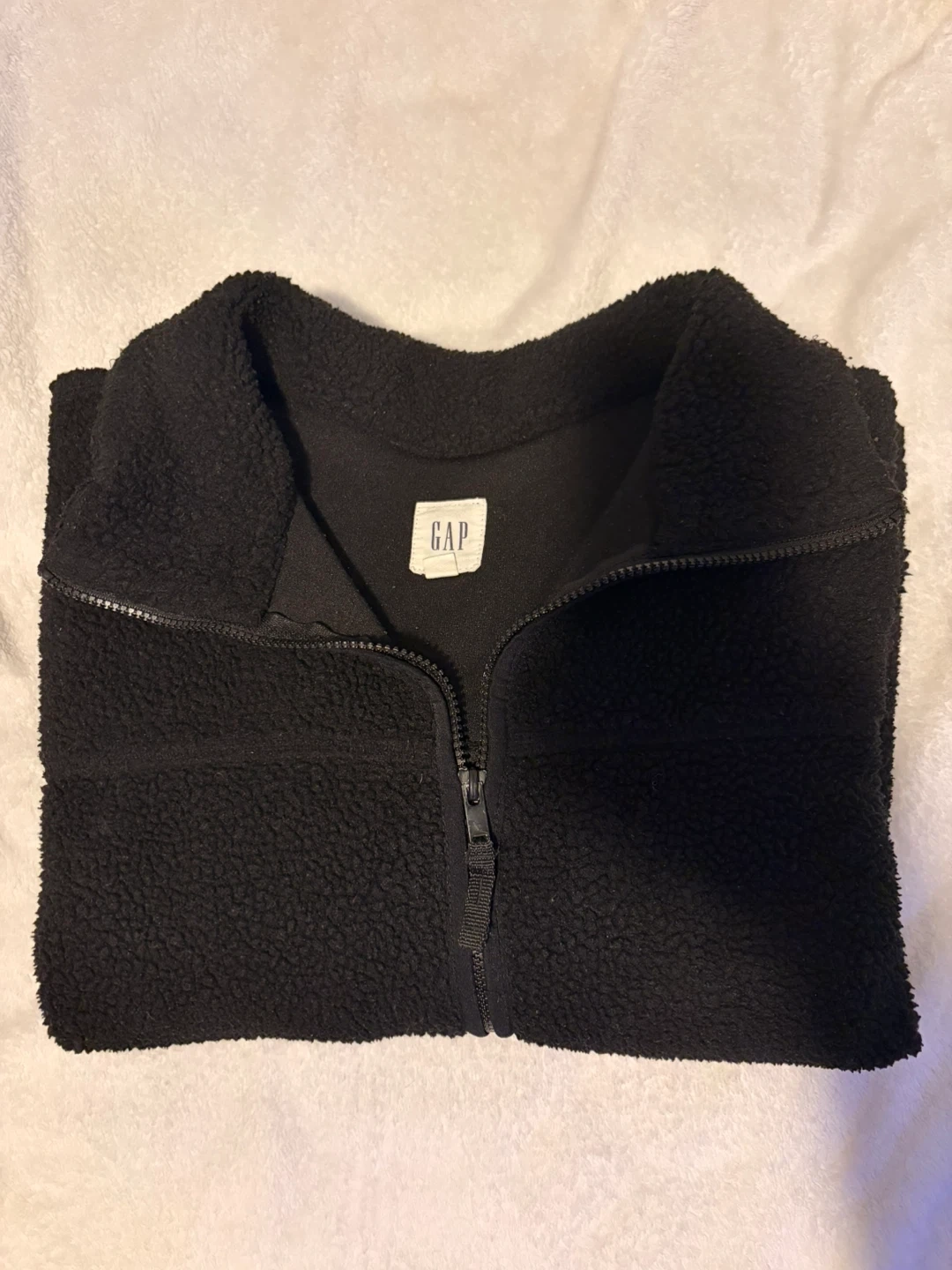 This is a black fleece half-zip jacket from GAP. It's a size XXL and made in Vietnam. The fuzzy material is cosy!