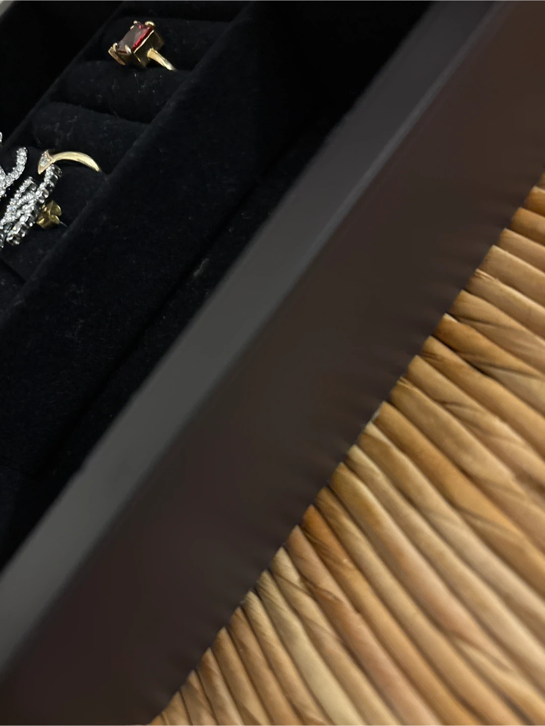 A dark wooden jewelry box featuring a mirrored lid and a decorative embossed butterfly panel. It has a black velvet-lined interior with compartments for rings and other small accessories. This box is perfect for organizing your cherished trinkets! *******JEWELRY NOT INCLUDED *****