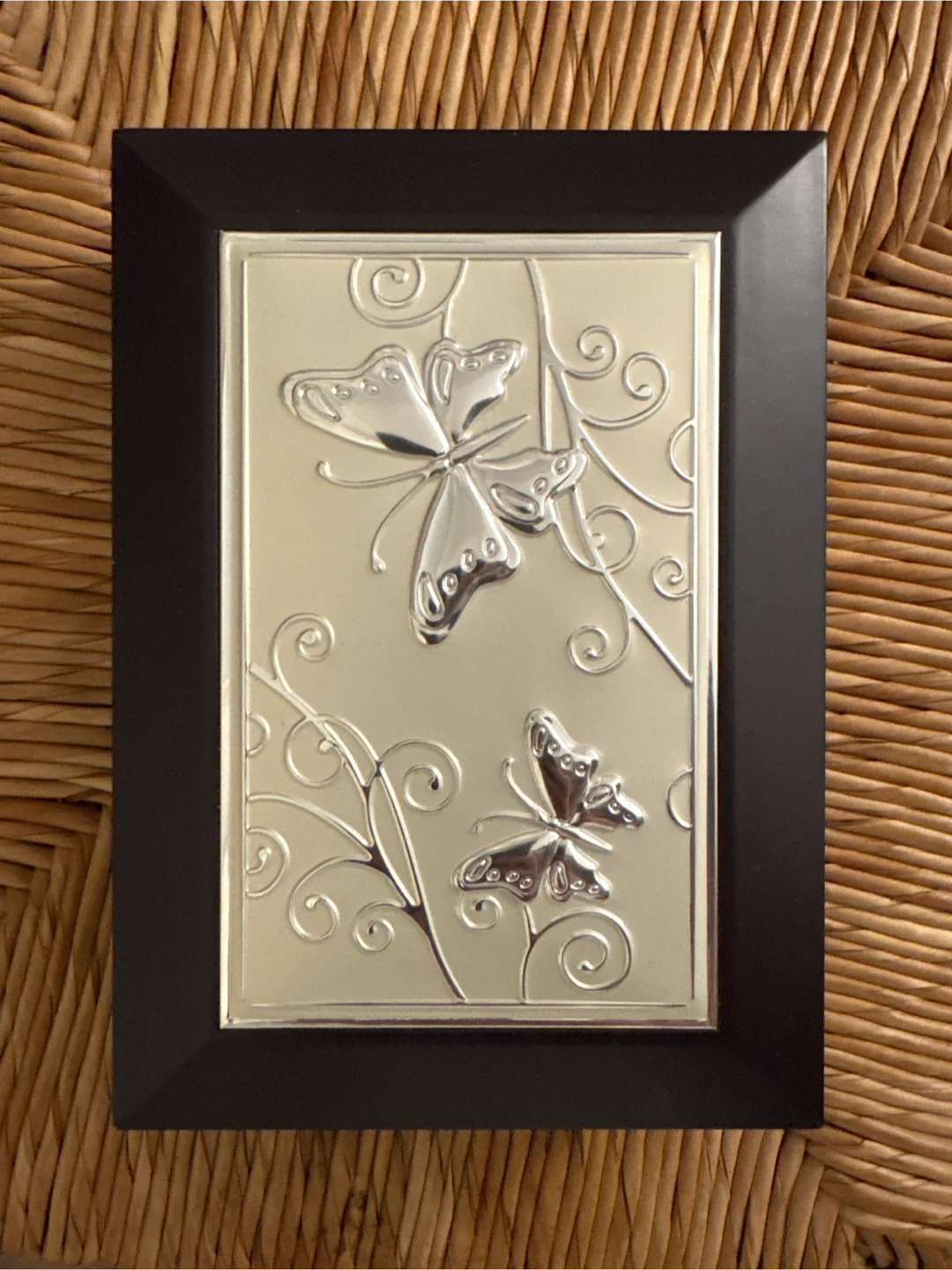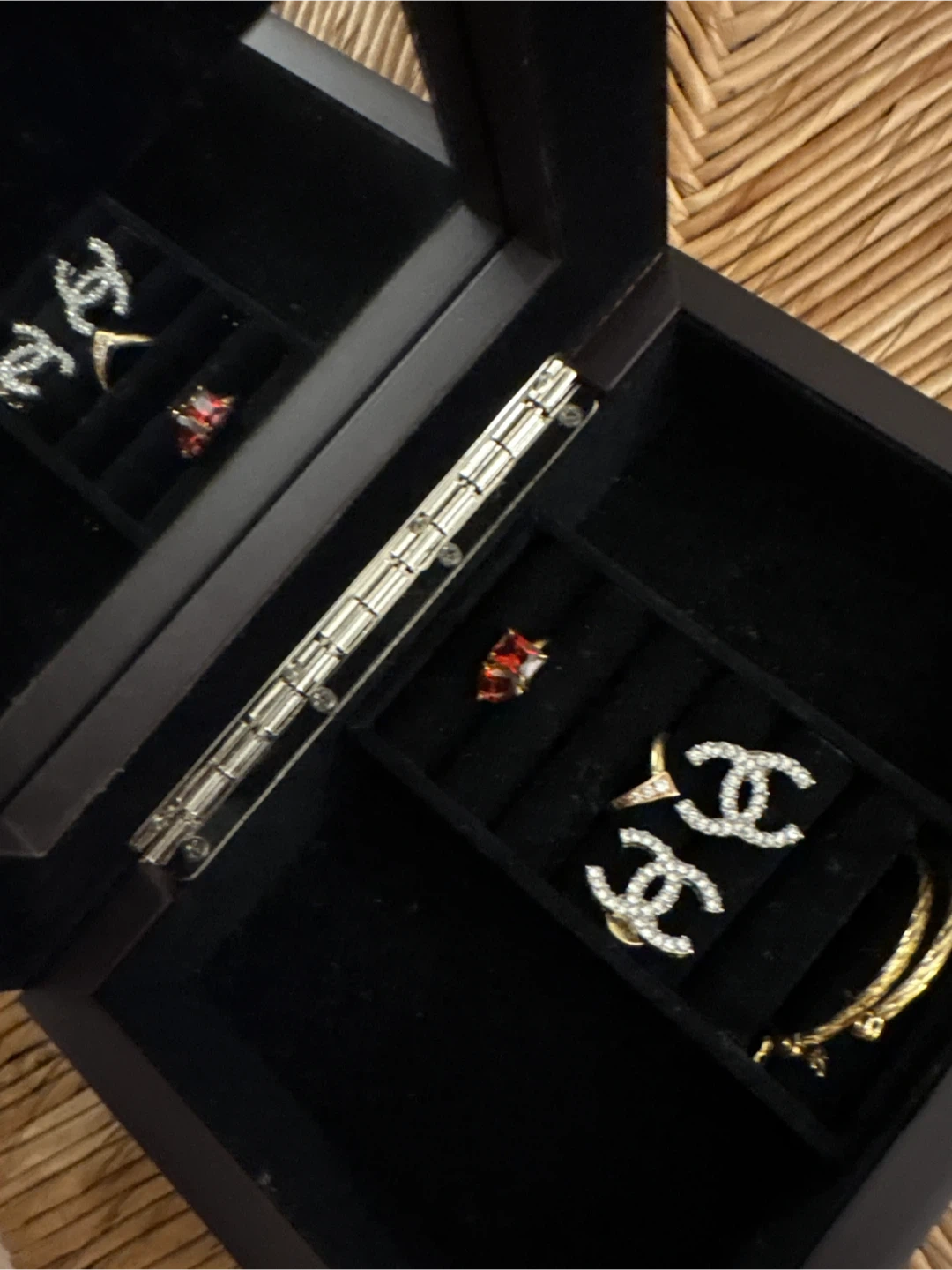 A dark wooden jewelry box featuring a mirrored lid and a decorative embossed butterfly panel. It has a black velvet-lined interior with compartments for rings and other small accessories. This box is perfect for organizing your cherished trinkets! *******JEWELRY NOT INCLUDED *****