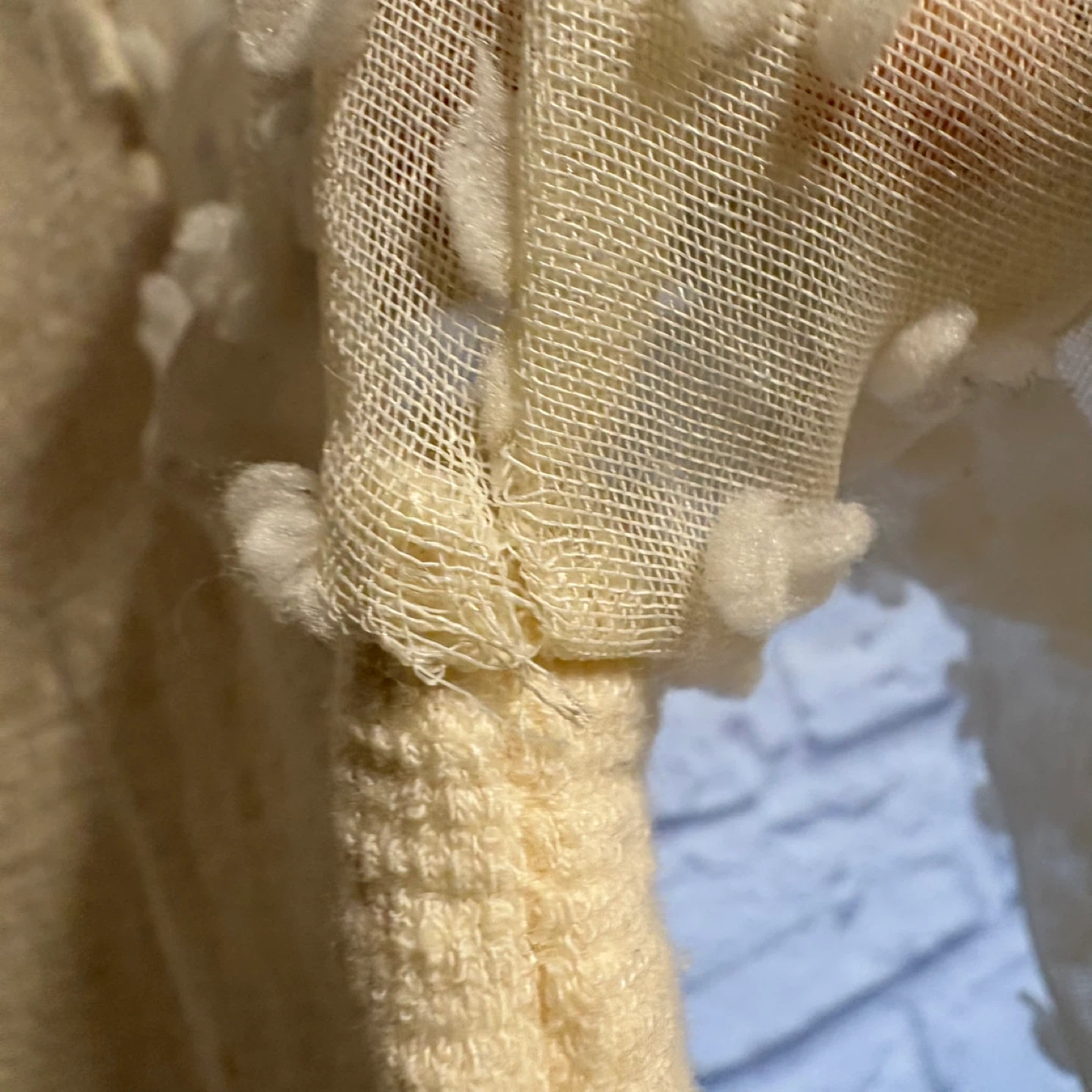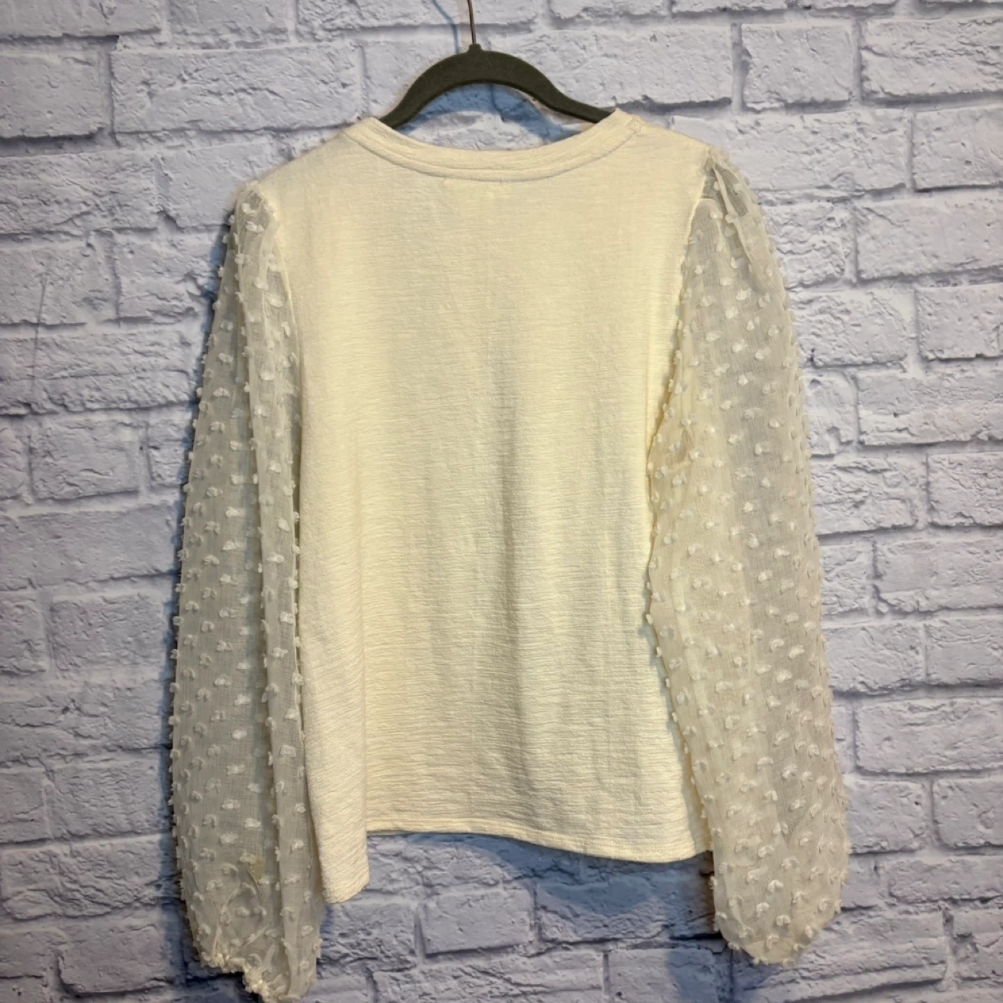Cream coloured top from Maeve by Anthropologie. It features textured fabric on the body with sheer, puff sleeves adorned with Swiss dots. Size medium. Excellent condition, armpits could use reinforcing. Retail is $70 USD. Pick up only.