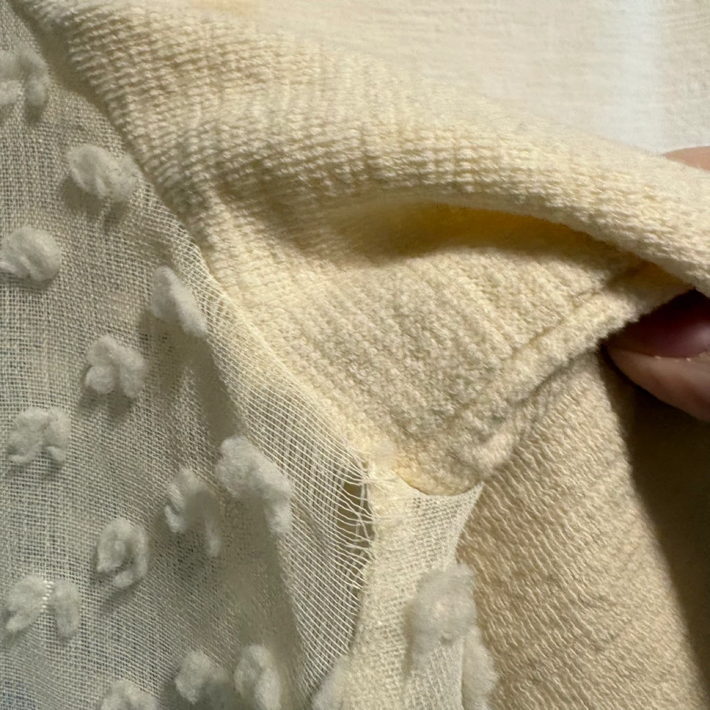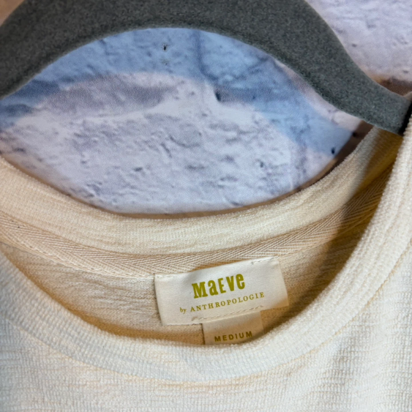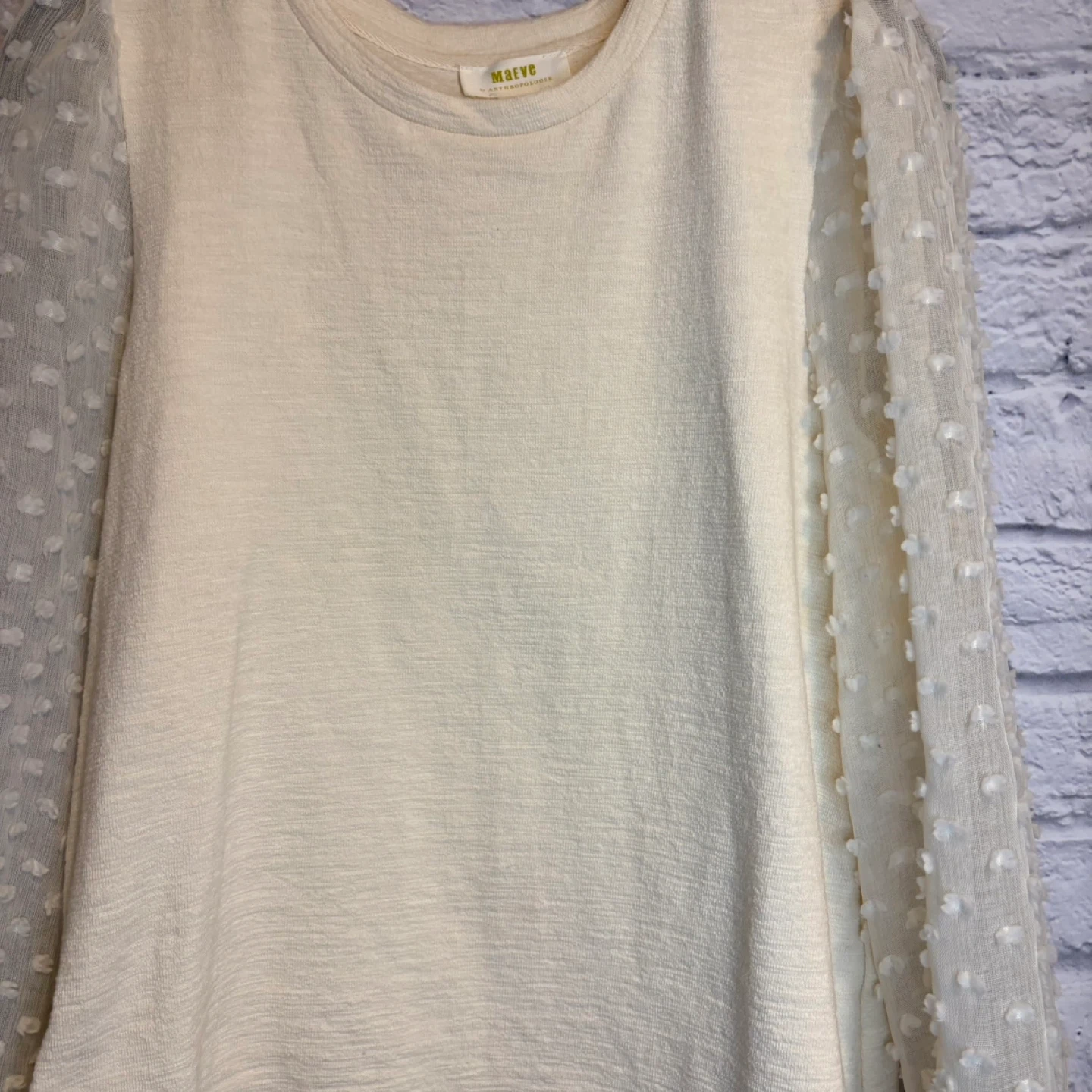 Cream coloured top from Maeve by Anthropologie. It features textured fabric on the body with sheer, puff sleeves adorned with Swiss dots. Size medium. Excellent condition, armpits could use reinforcing. Retail is $70 USD. Pick up only.