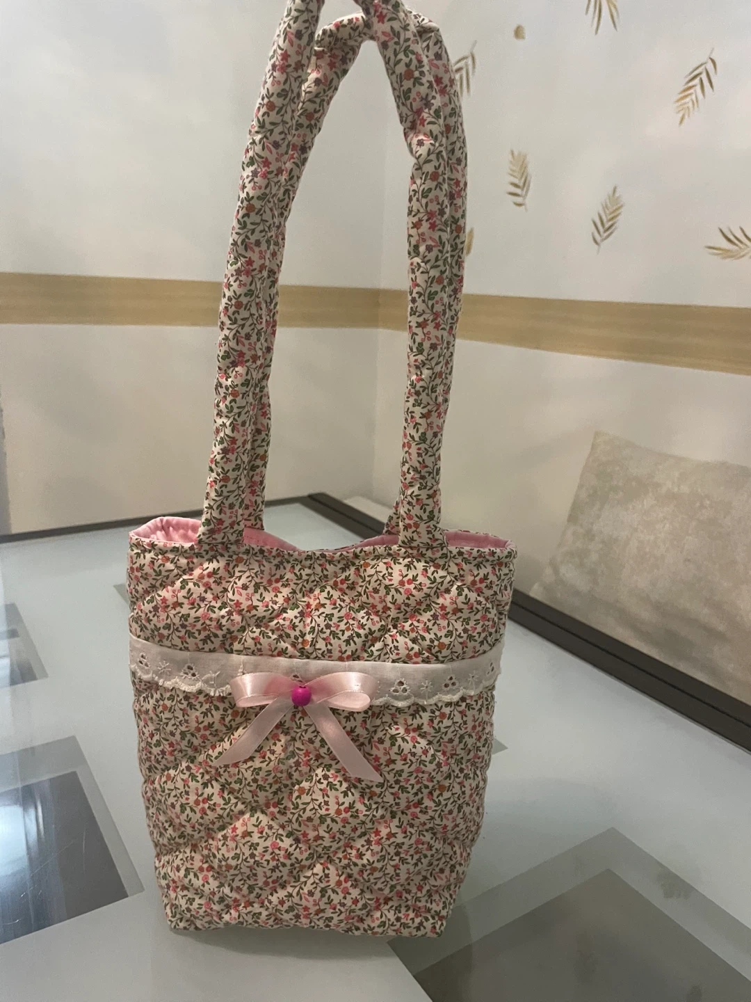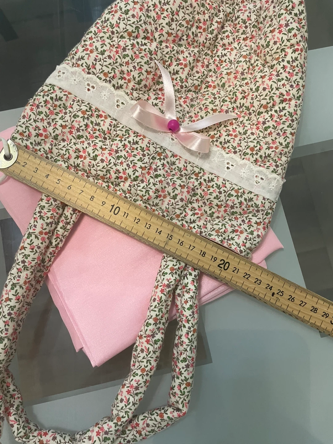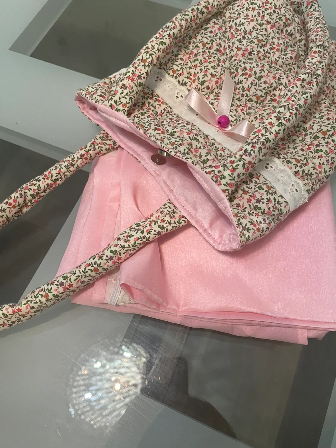 This sweet quilted handbag features a charming floral print and lace trim. It's lined in pink satin and has a secure snap closure with pink pray cloth set for kids (4-5 years old)the bag perfect for carrying the set