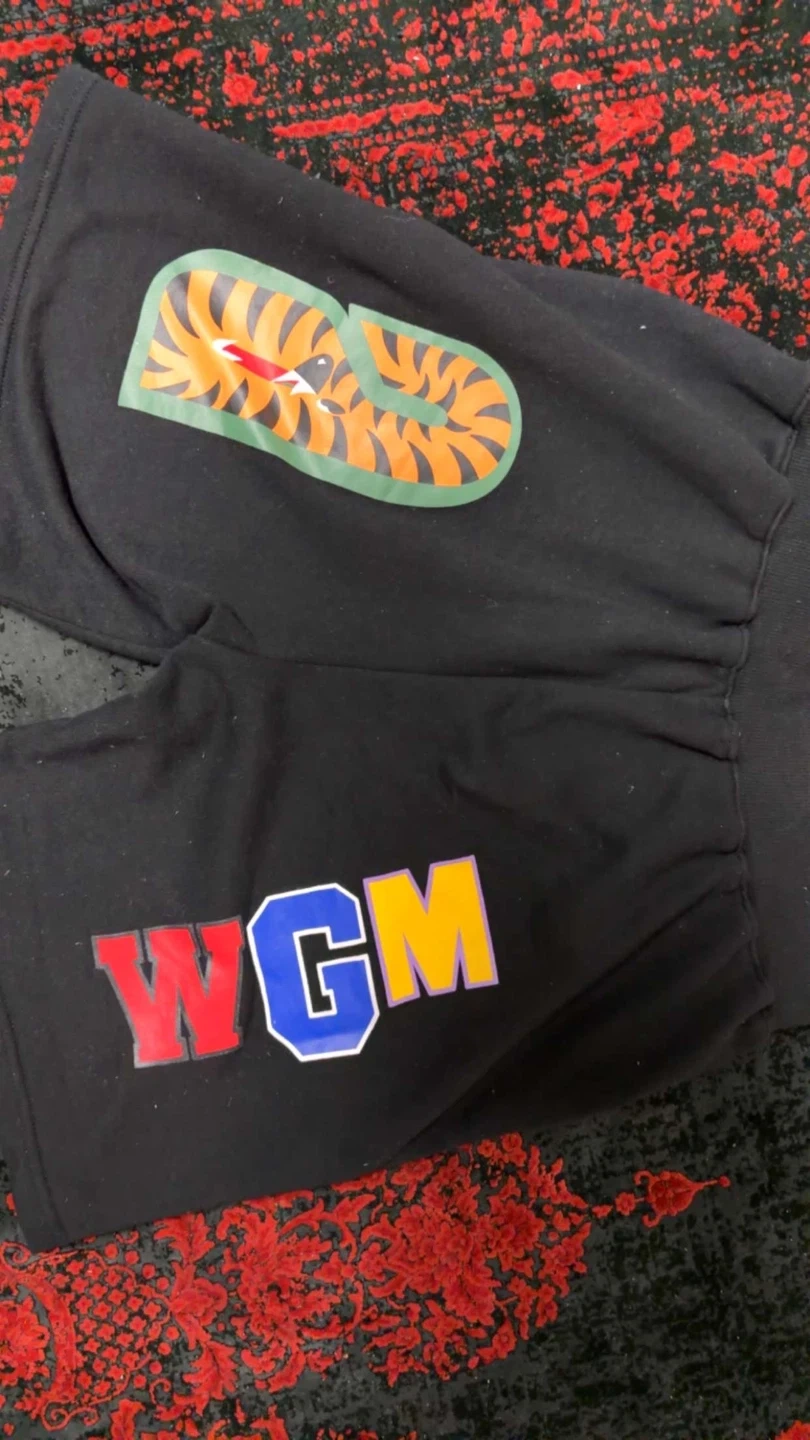 Black BAPE shorts featuring the iconic shark face graphic and "WGM" lettering. Made with comfortable fabric. These shorts are sure to make a statement!