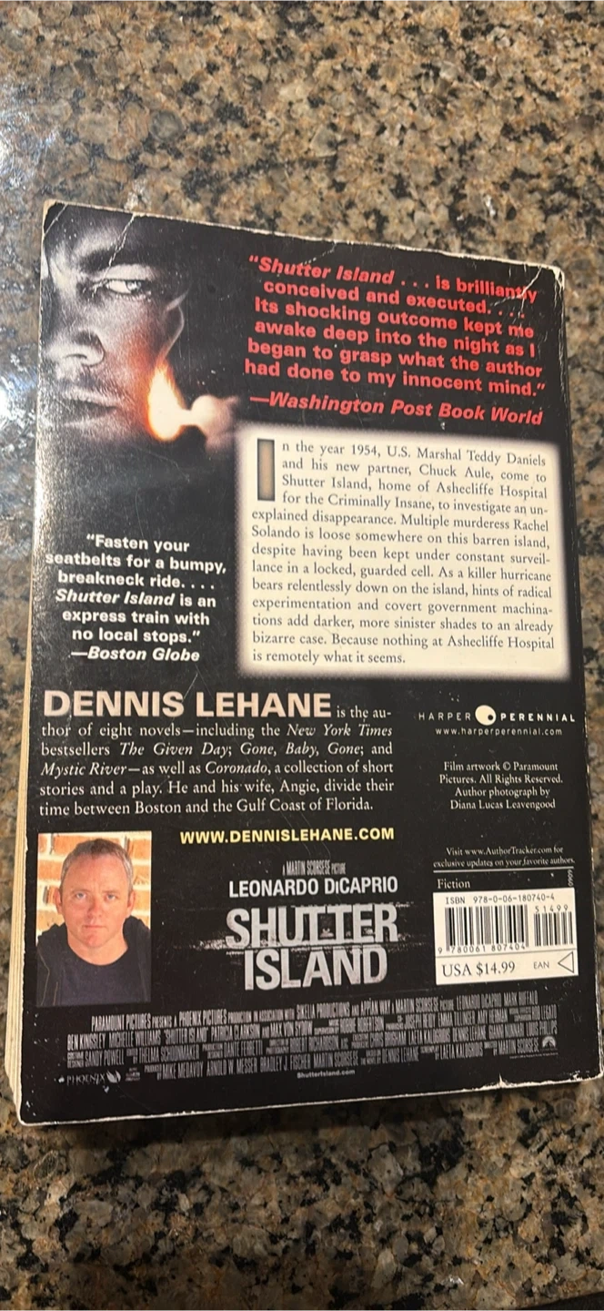 This is the paperback edition of Dennis Lehane's "Shutter Island." It's a New York Times bestseller and was made into a major motion picture. This thriller is known for its suspenseful plot and shocking twists.