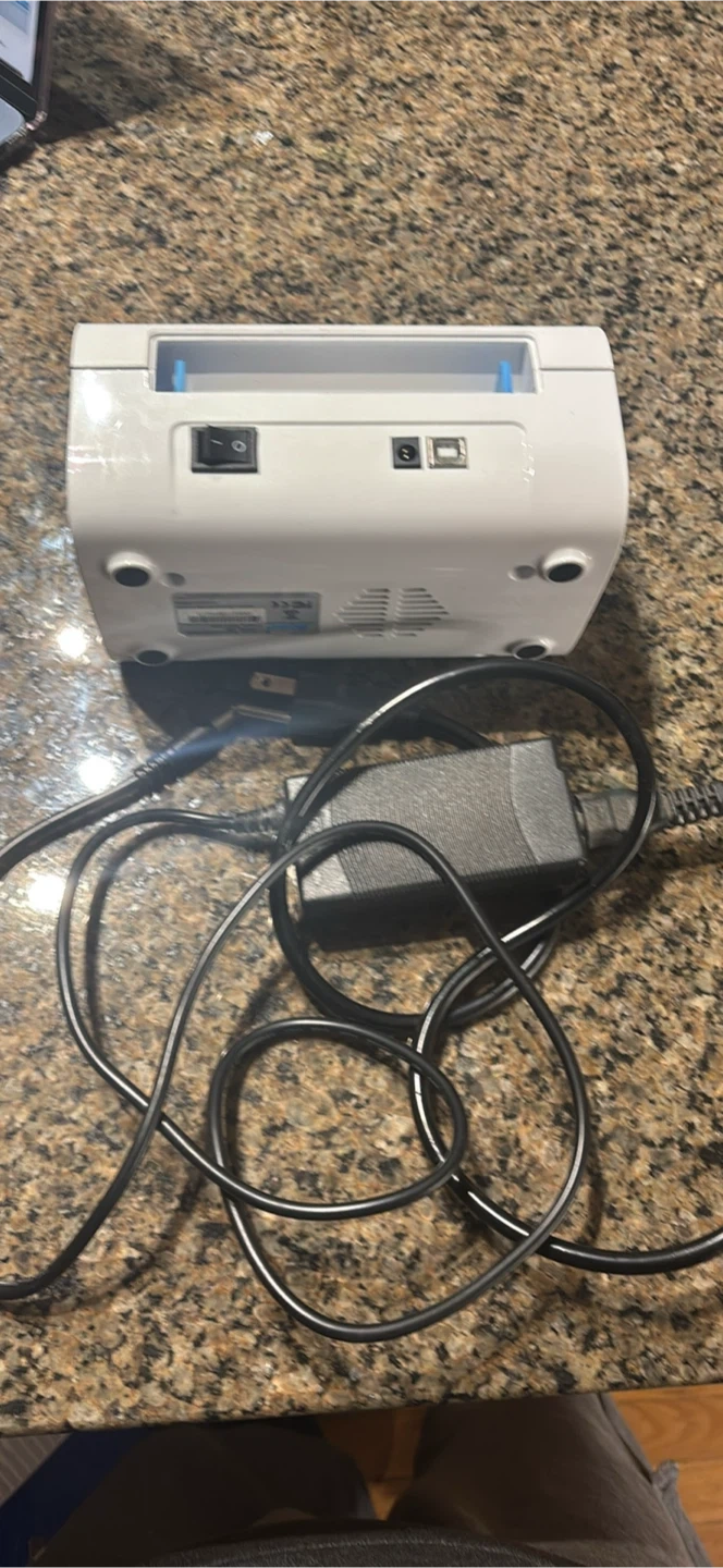 This is a white Jiose portable label maker. It includes the label maker unit, a power adapter, and a separate input tray. It's great for home organization needs!