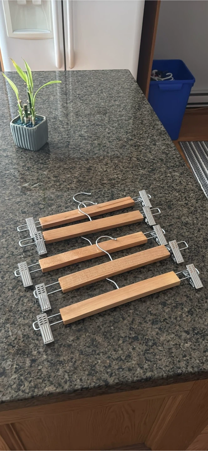 This set includes five wooden hangers with adjustable metal clips. They're great for organizing pants, skirts, and other apparel. Hangers are made of wood and metal.