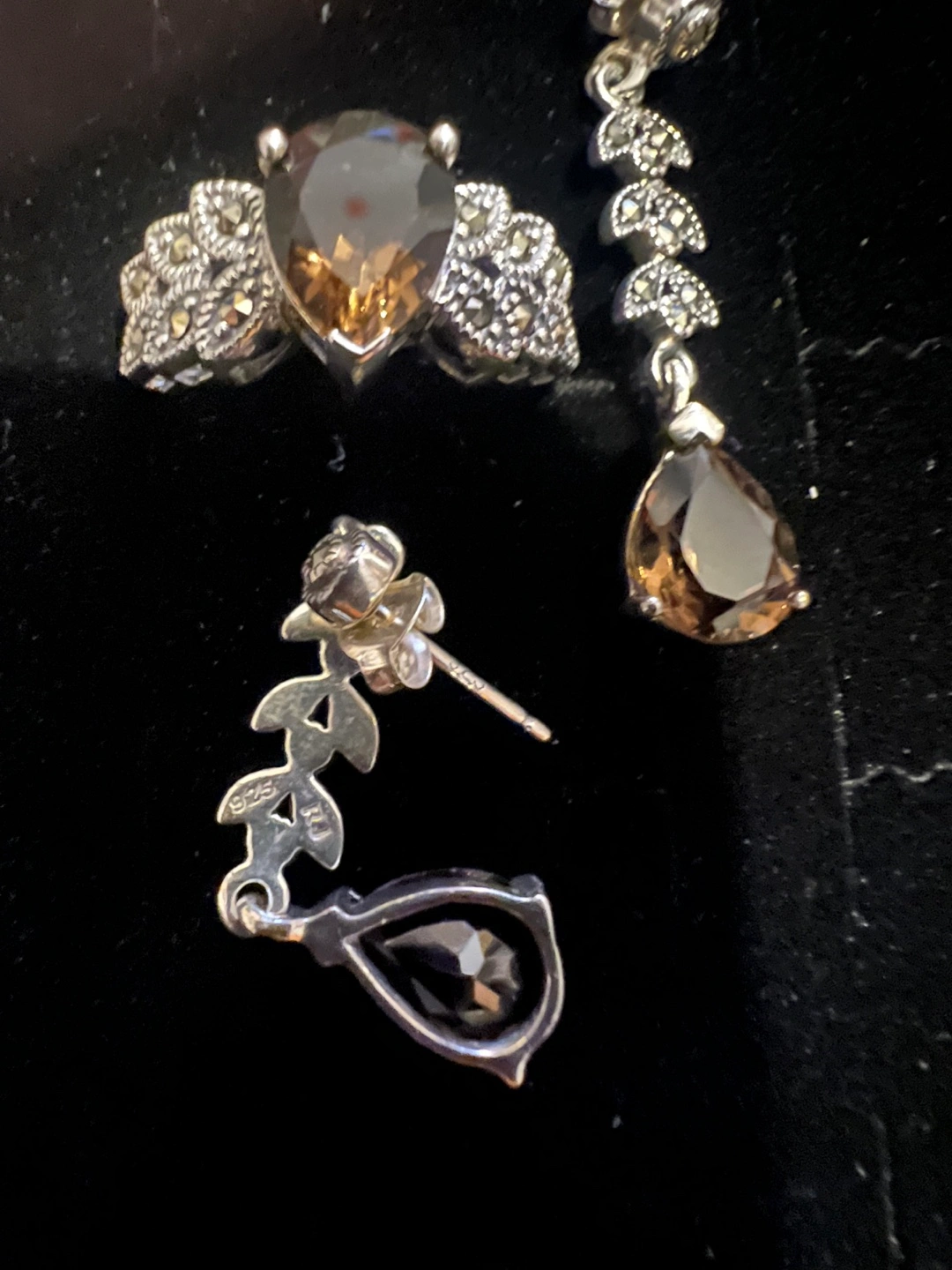This elegant set features a sterling silver ring and matching dangle earrings, each adorned with pear-shaped smoky quartz stones. The ring's band is intricately detailed with smaller stones. Sterling silver construction.