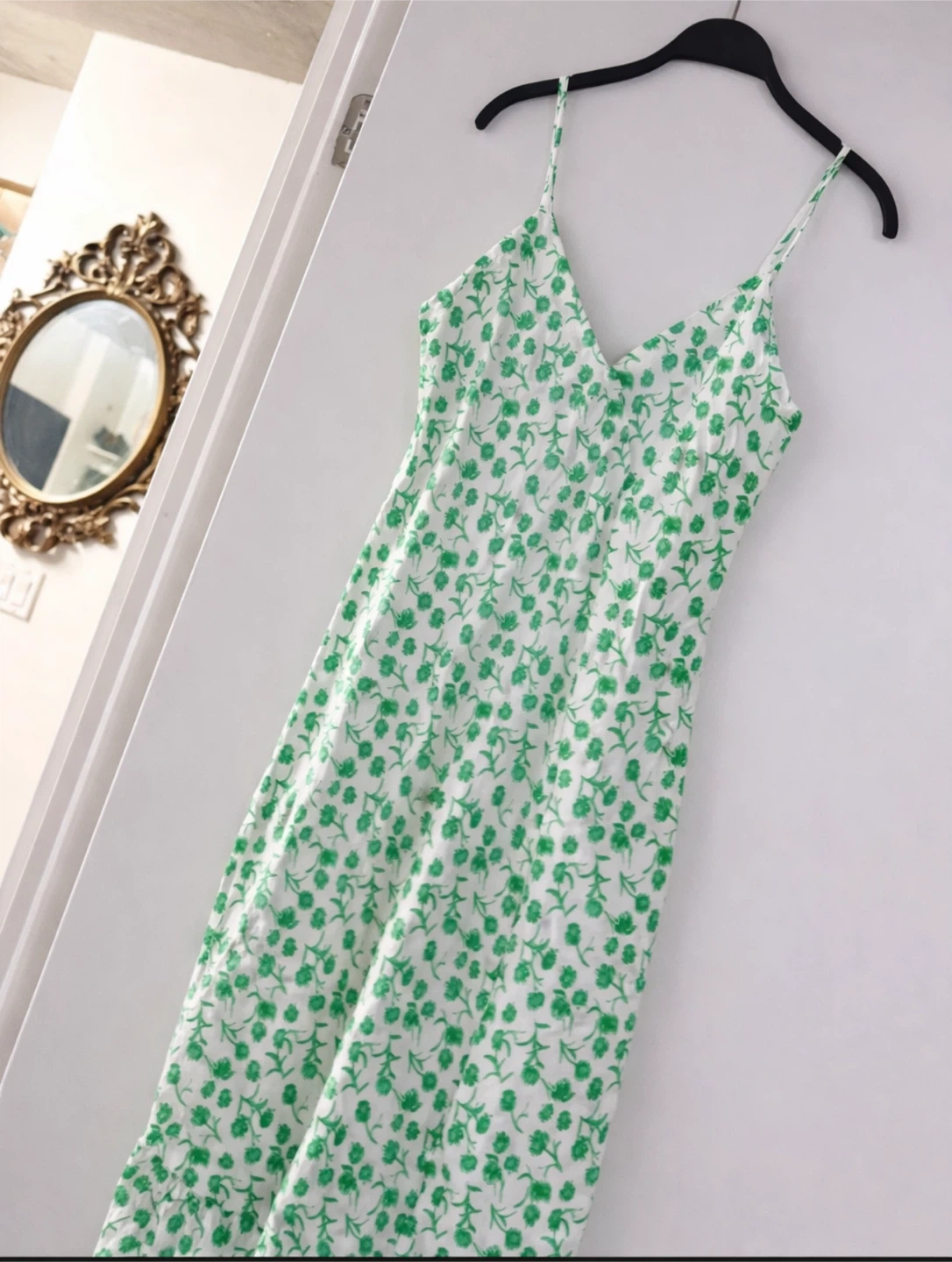 This is a cream midi slip dress with a green floral print. It features a V-neckline and adjustable spaghetti straps. The fabric is lightweight, making it perfect for warmer weather.