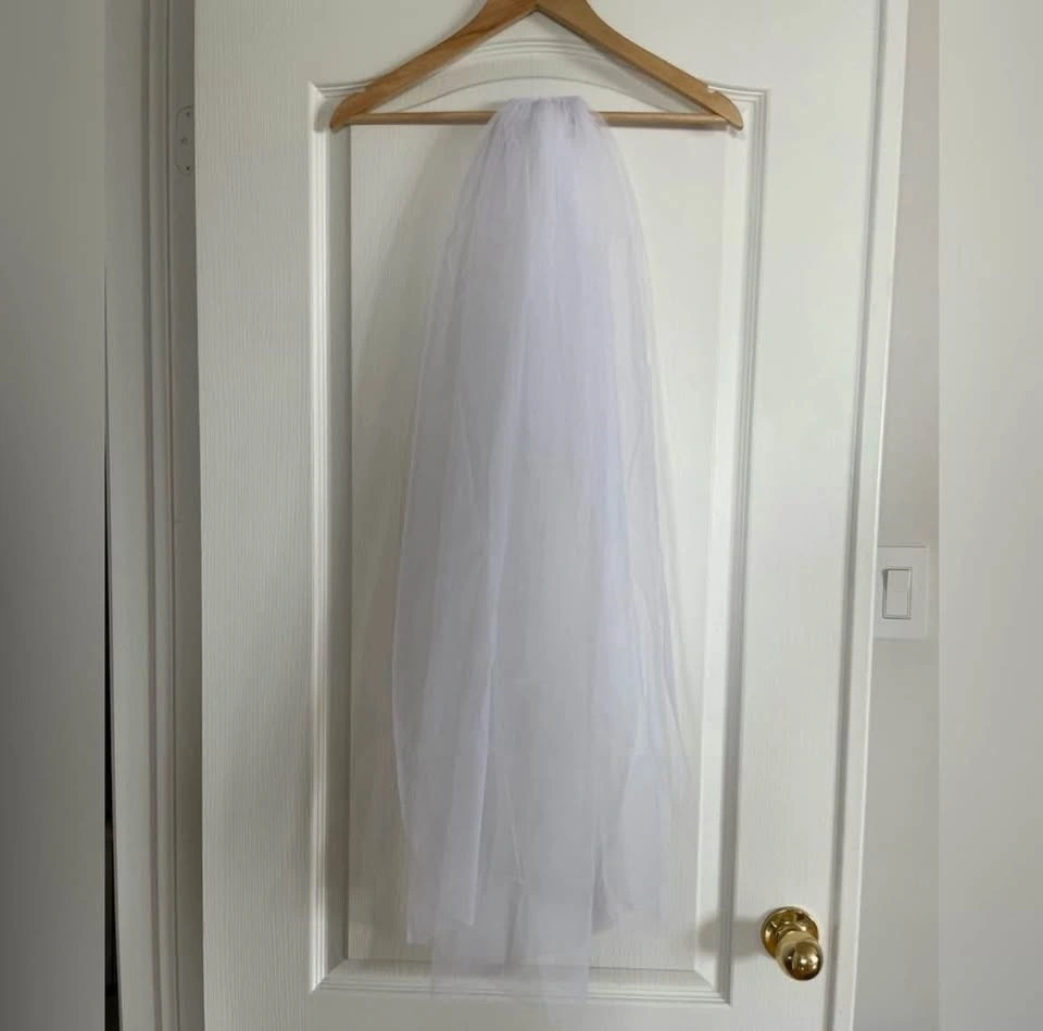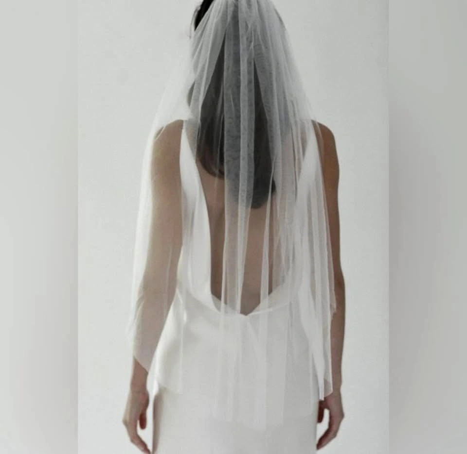 Elegant designer fingertip-length wedding veil in crisp white, featuring a clean raw edge finish for a modern, minimalist look. Crafted from soft, flowing tulle and includes a silver comb for secure, effortless styling. Purchased from a high-end bridal boutique but never used — it’s in flawless, new condition. Measurements: 62” W x 39” L — perfect for brides seeking a timeless veil that pairs beautifully with nearly any gown.
