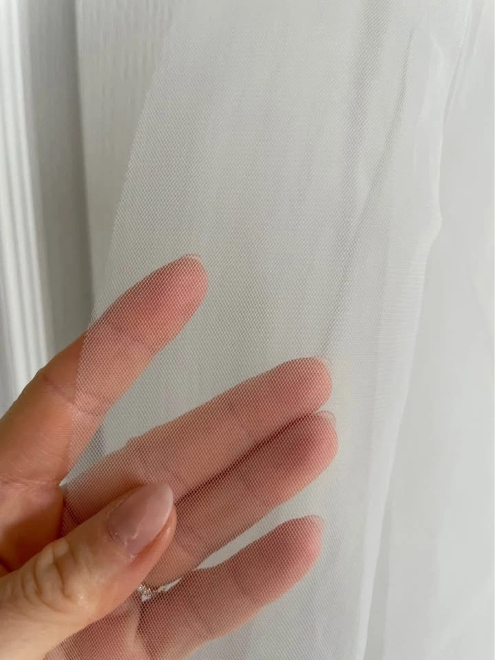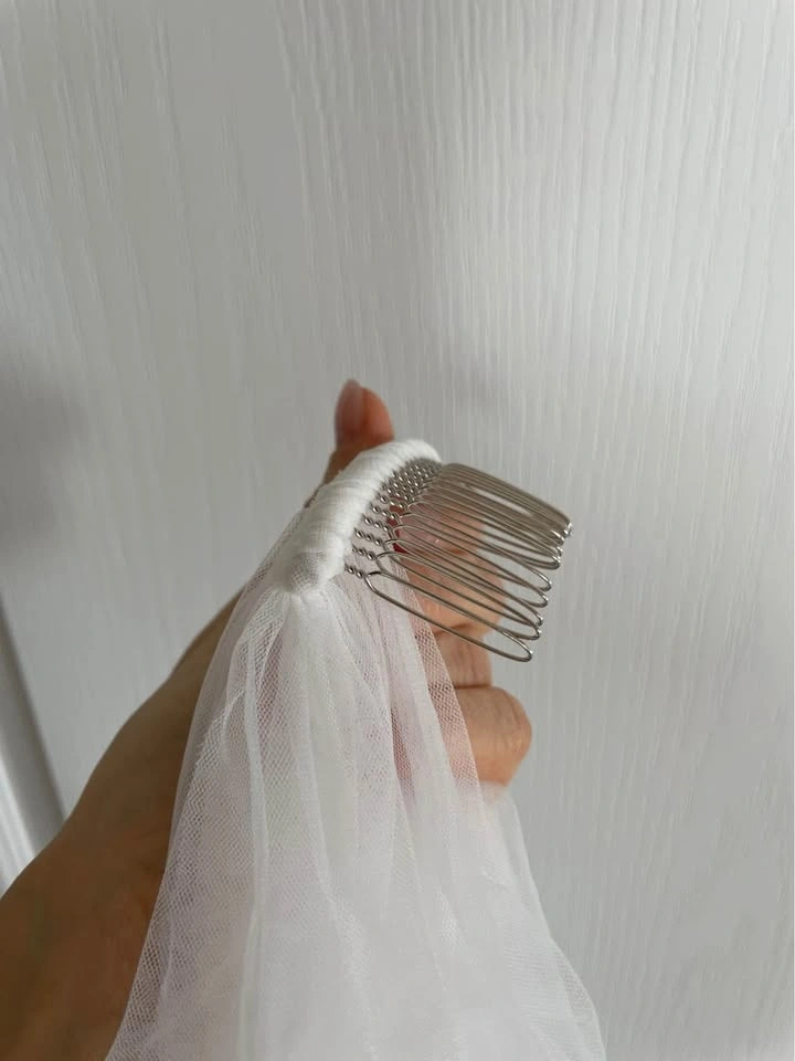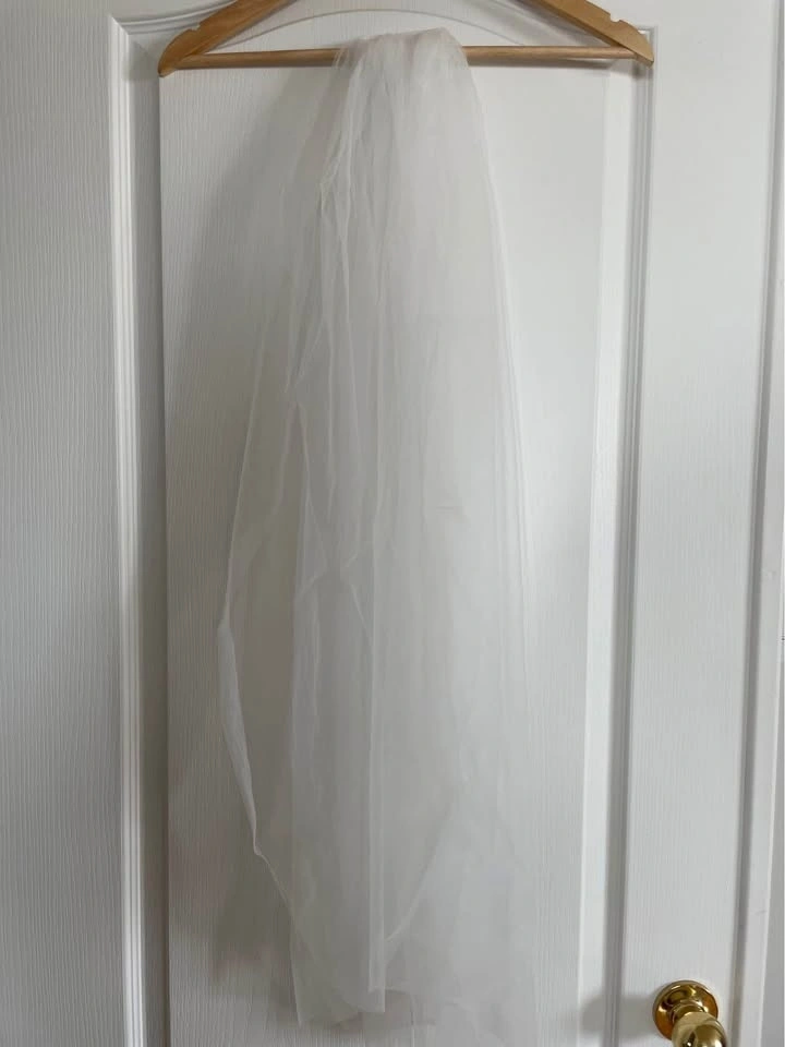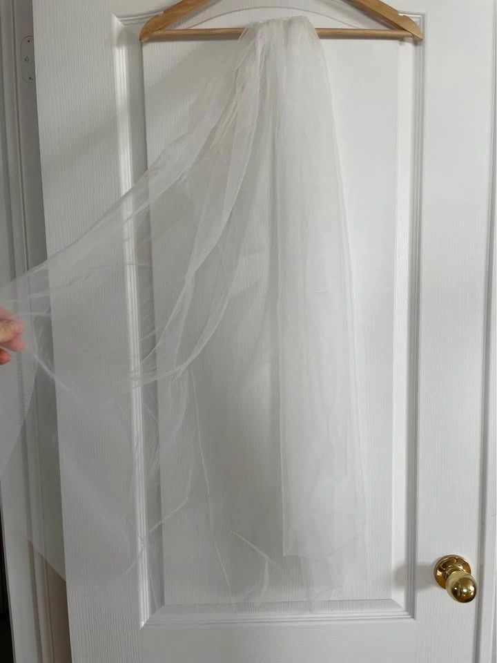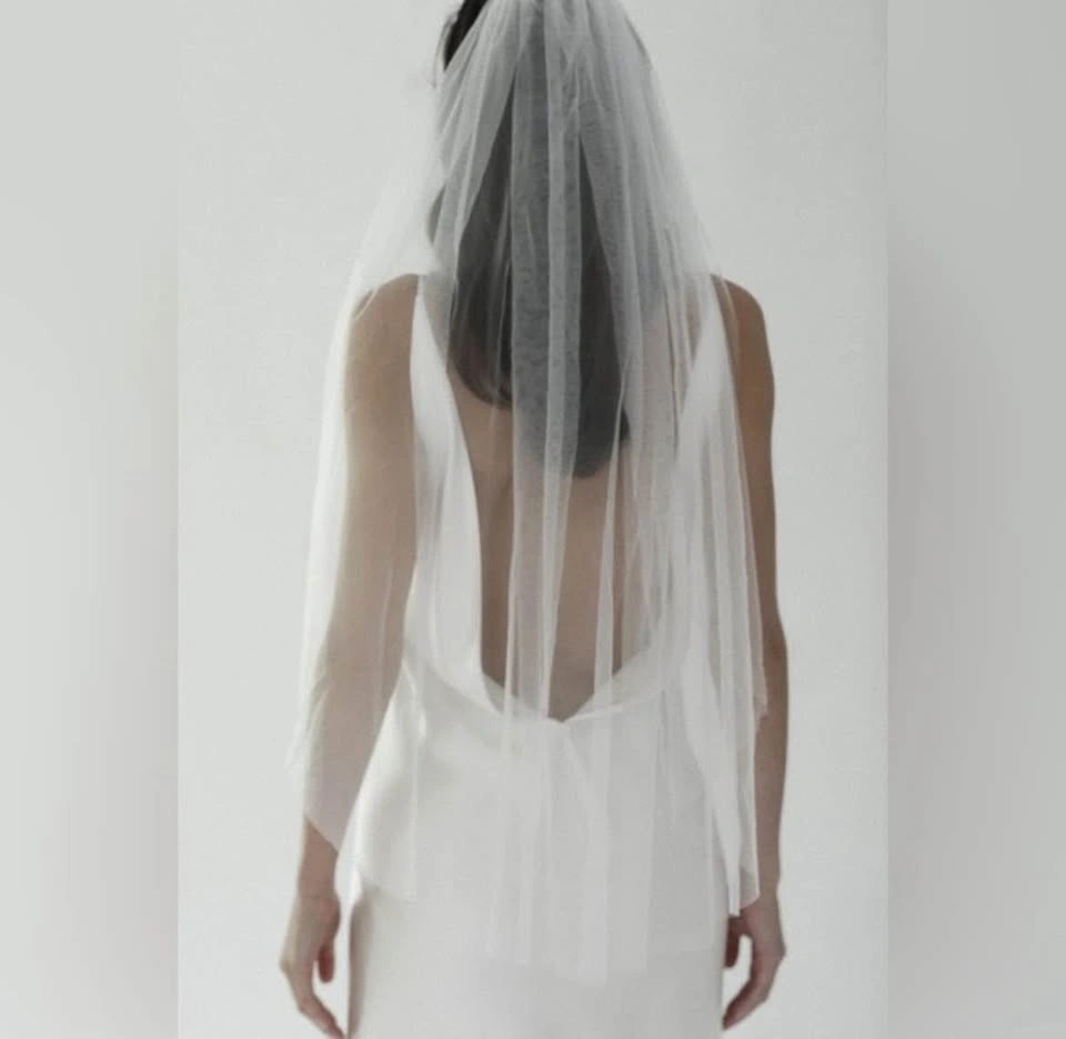 Designer fingertip-length wedding veil in ivory, featuring a clean raw edge finish for a modern, minimalist look. Crafted from soft, flowing tulle and includes a silver comb for secure, effortless styling. Brand new, never worn. Measurements: 62” W x 39” L.