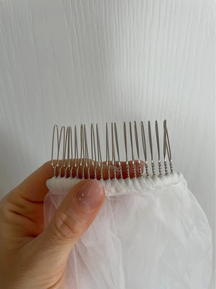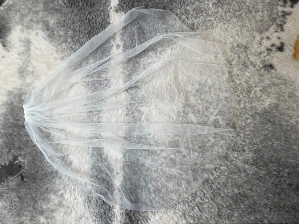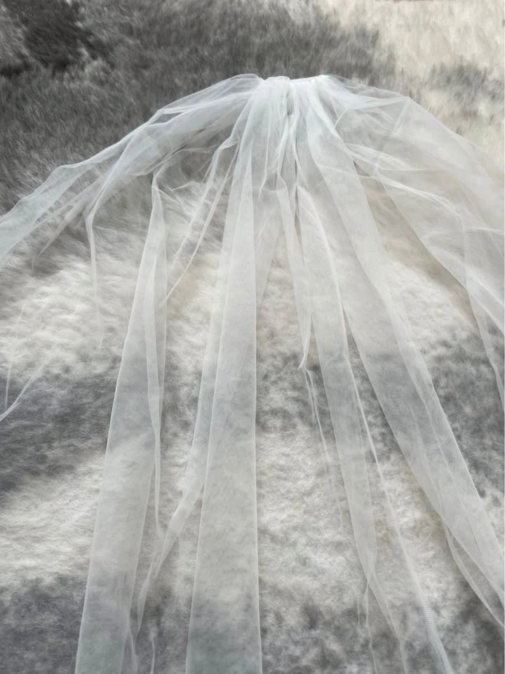 Designer fingertip-length wedding veil in ivory, featuring a clean raw edge finish for a modern, minimalist look. Crafted from soft, flowing tulle and includes a silver comb for secure, effortless styling. Brand new, never worn. Measurements: 62” W x 39” L.