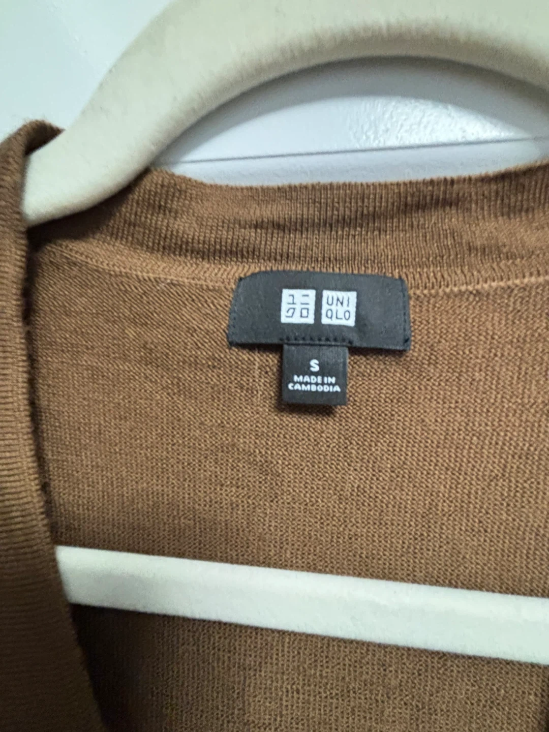 Uniqlo women's cardigan made from 100% wool. It's a size small in a rich brown colour. Button front closure.