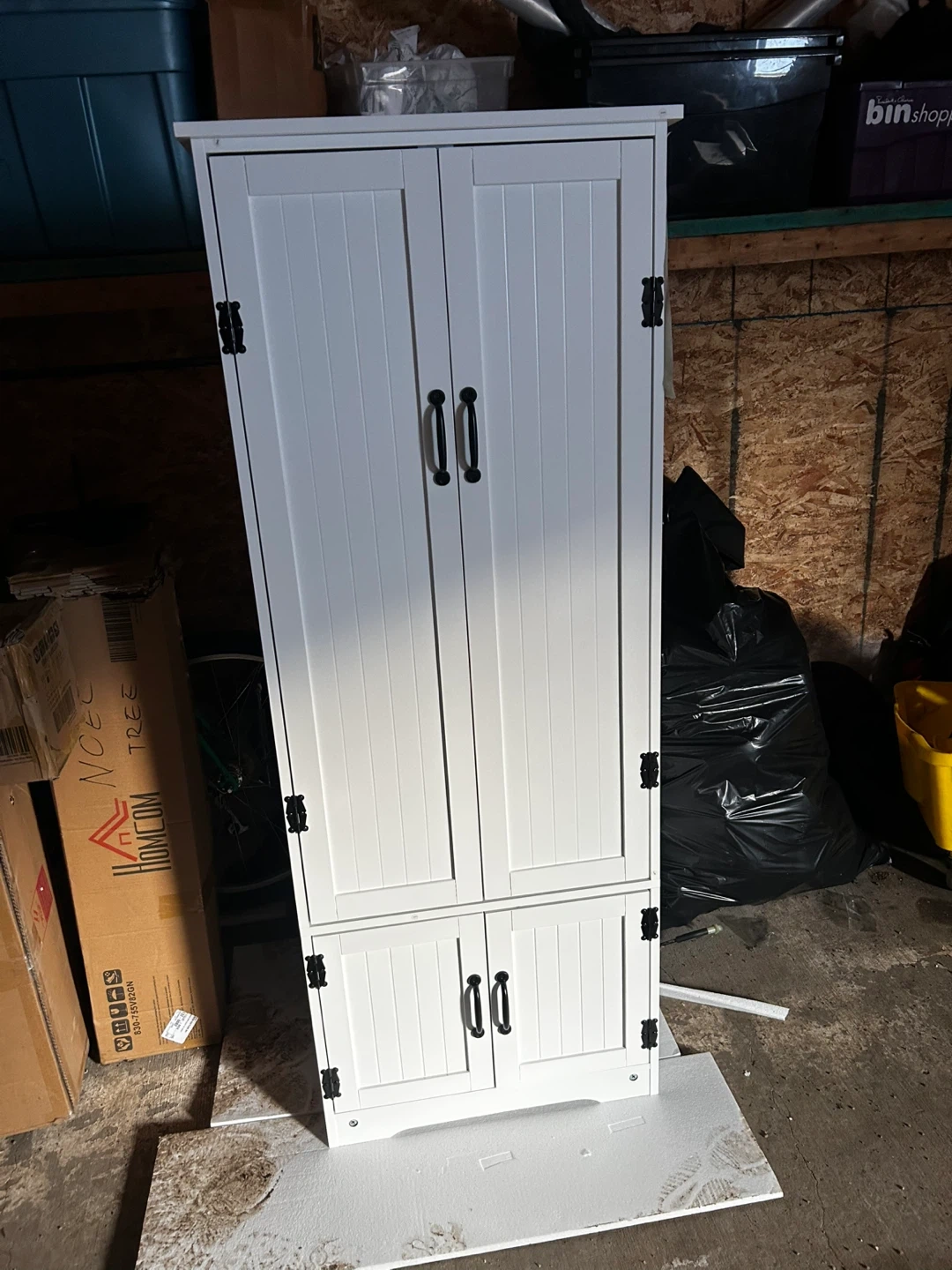 Brand New!! This white storage cabinet has a versatile design with four doors and adjustable shelves for ample storage. Its tall, narrow profile is perfect for maximizing space in kitchens or pantries. The cabinet's white finish and beadboard doors offer a classic look.