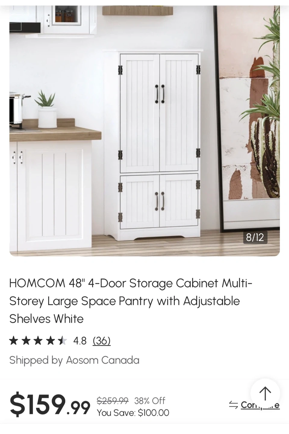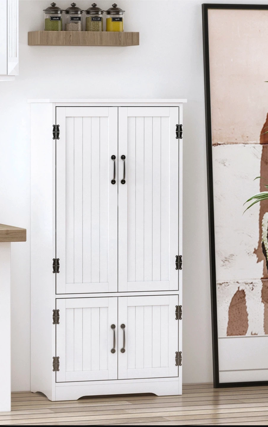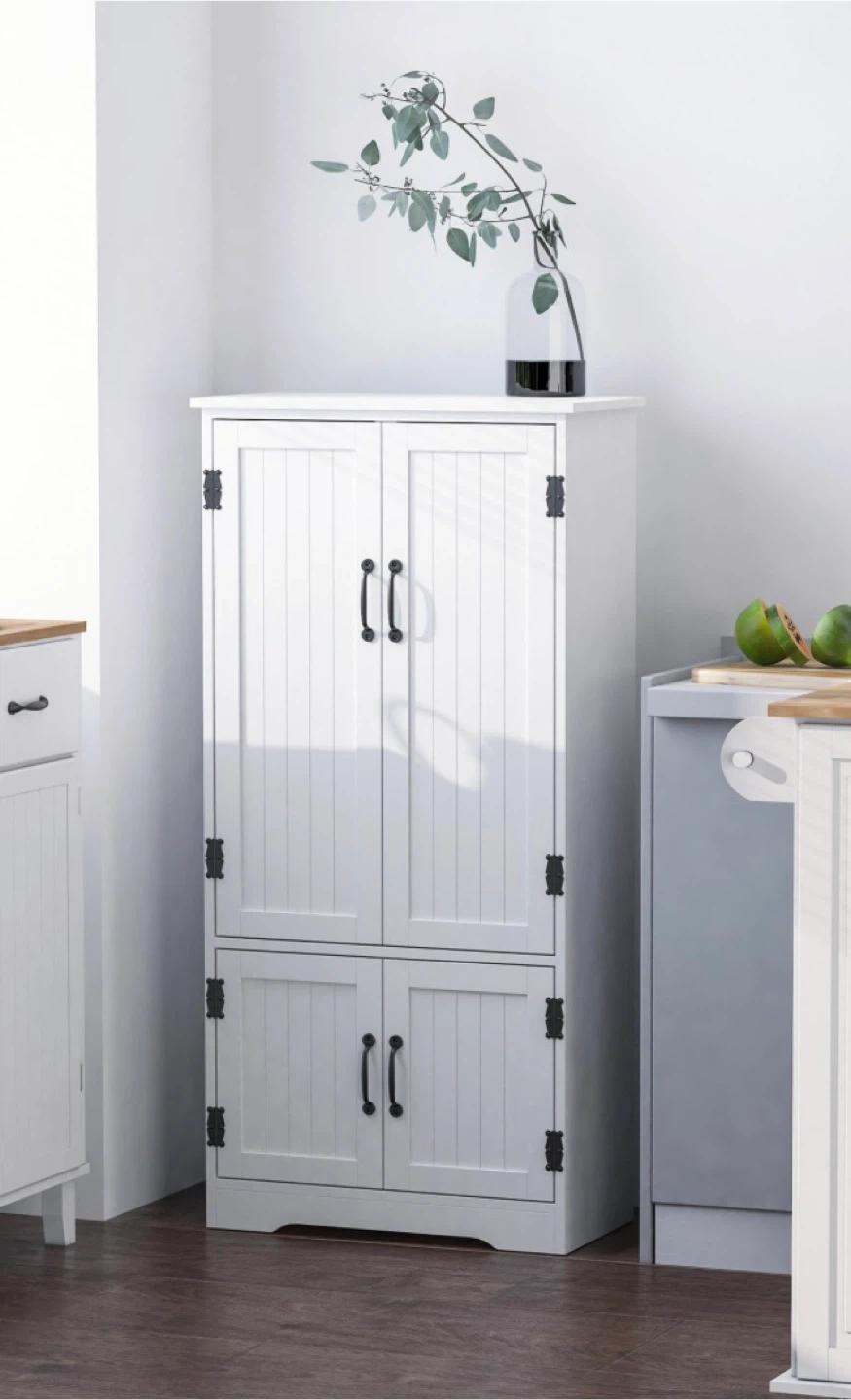 Brand New!! This white storage cabinet has a versatile design with four doors and adjustable shelves for ample storage. Its tall, narrow profile is perfect for maximizing space in kitchens or pantries. The cabinet's white finish and beadboard doors offer a classic look.
