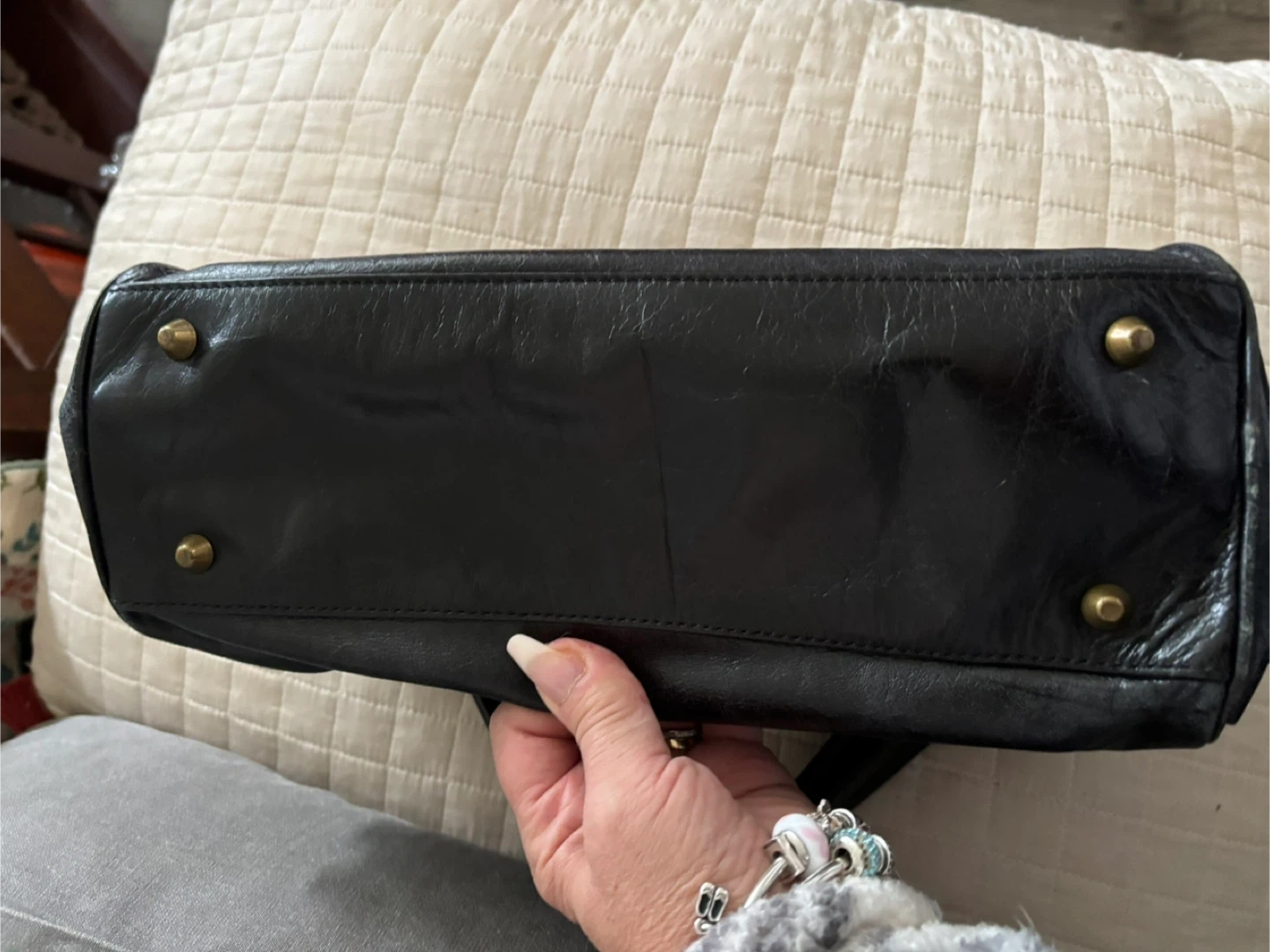 Classic black leather handbag from Cynthia Rowley. It features a front pocket with buckle closure and decorative chain detailing on the straps. Bag has metal feet on the bottom for protection.
