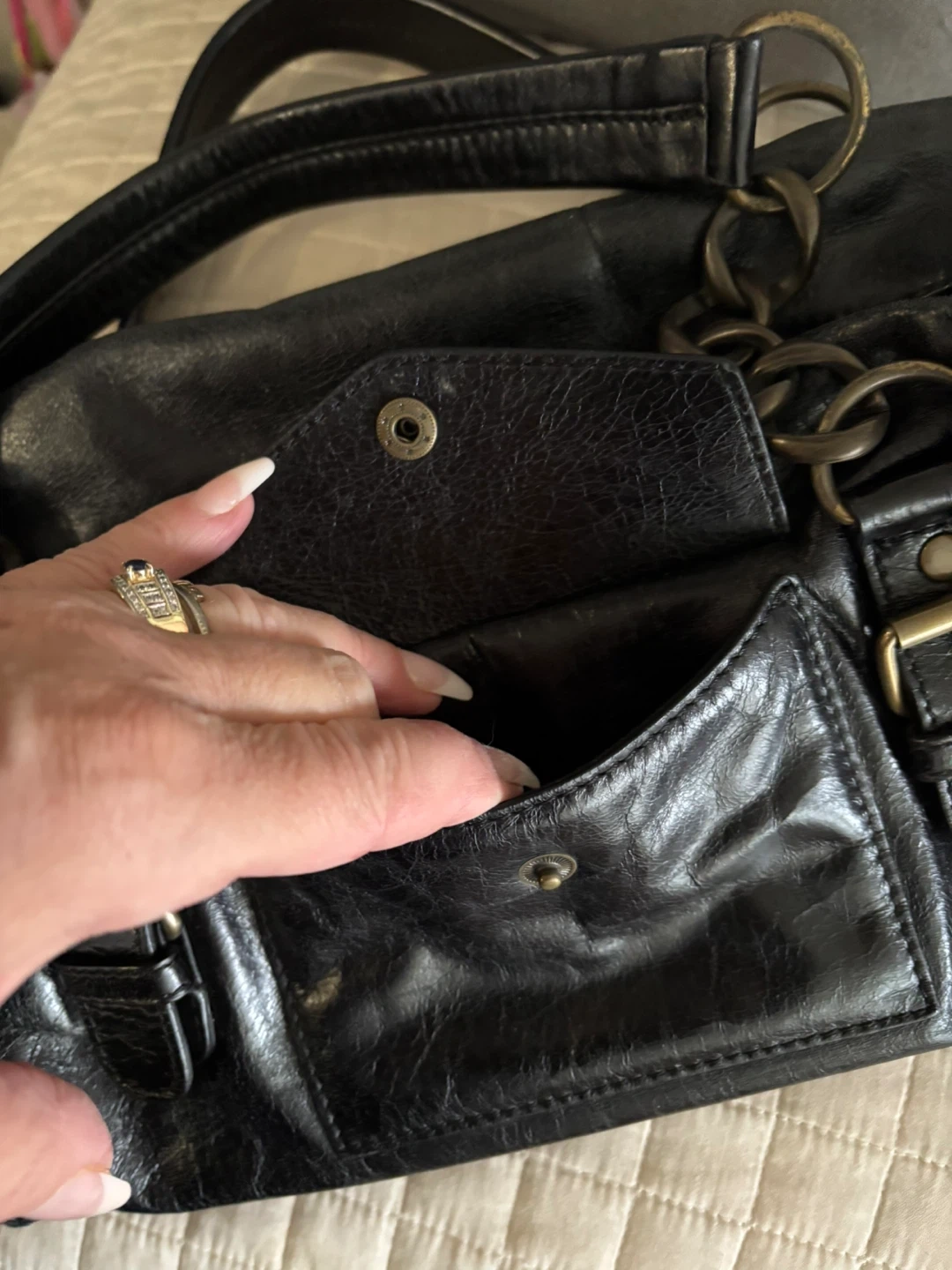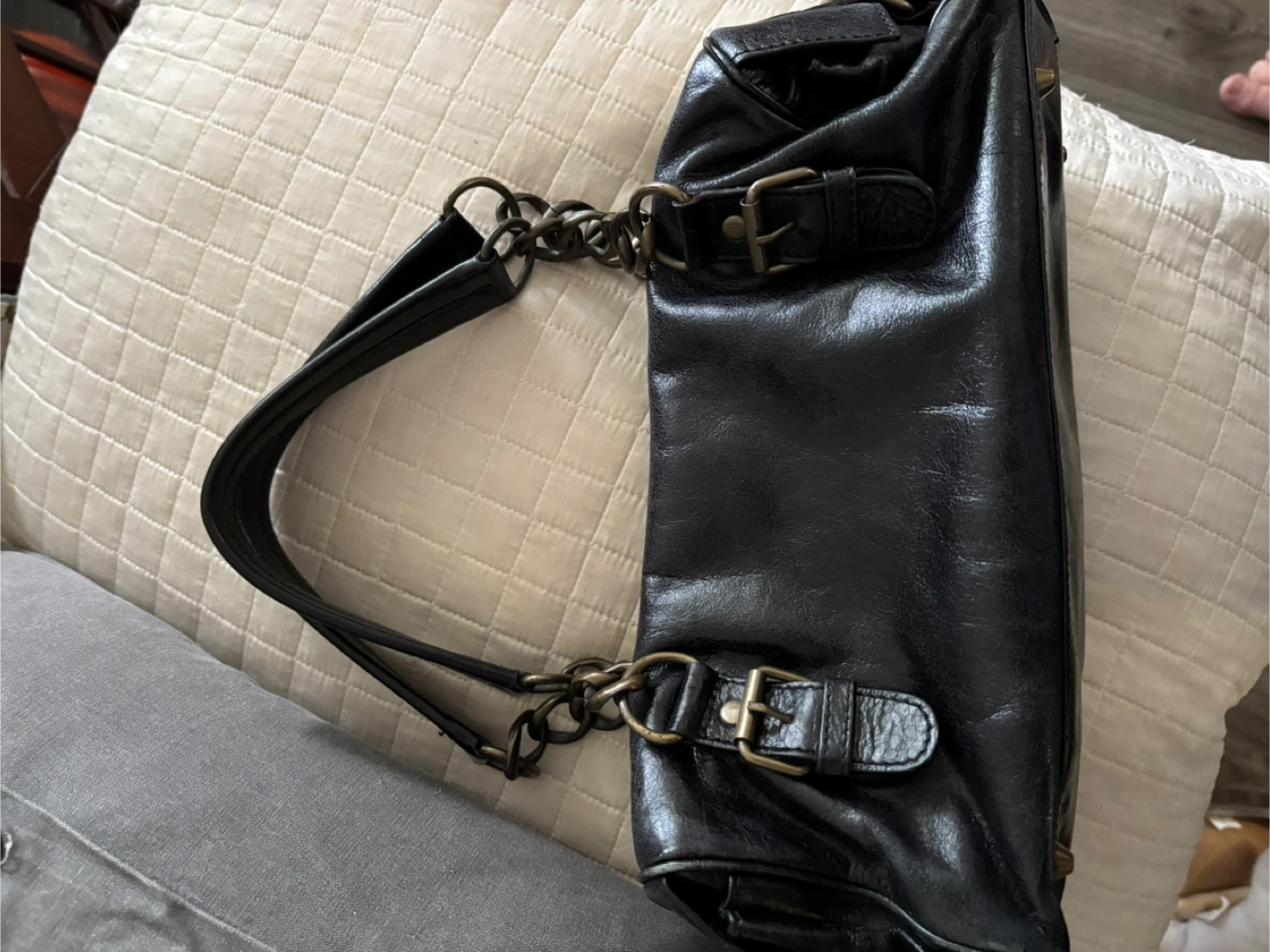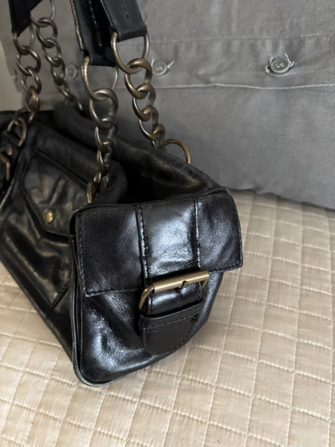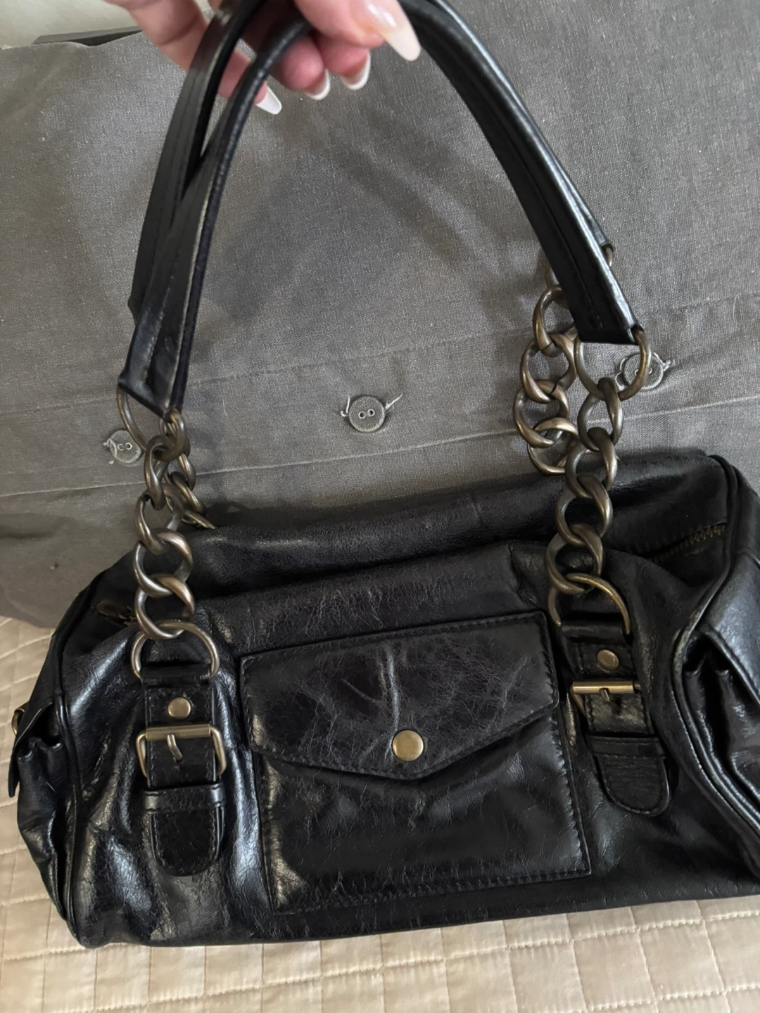 Classic black leather handbag from Cynthia Rowley. It features a front pocket with buckle closure and decorative chain detailing on the straps. Bag has metal feet on the bottom for protection.