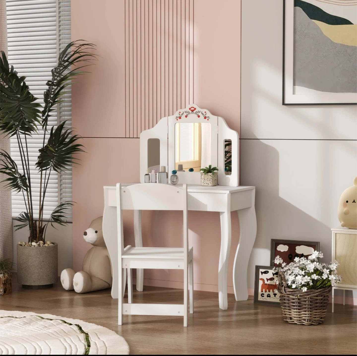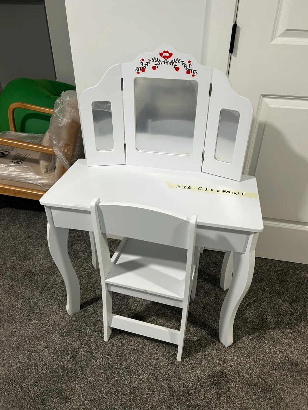Brand New!! Vanity set is designed for kids aged 3-8. It's a dual-use dressing table with a removable tri-folding mirror. The set includes a drawer for storage. It's white with floral decorative accents on the mirror frame.