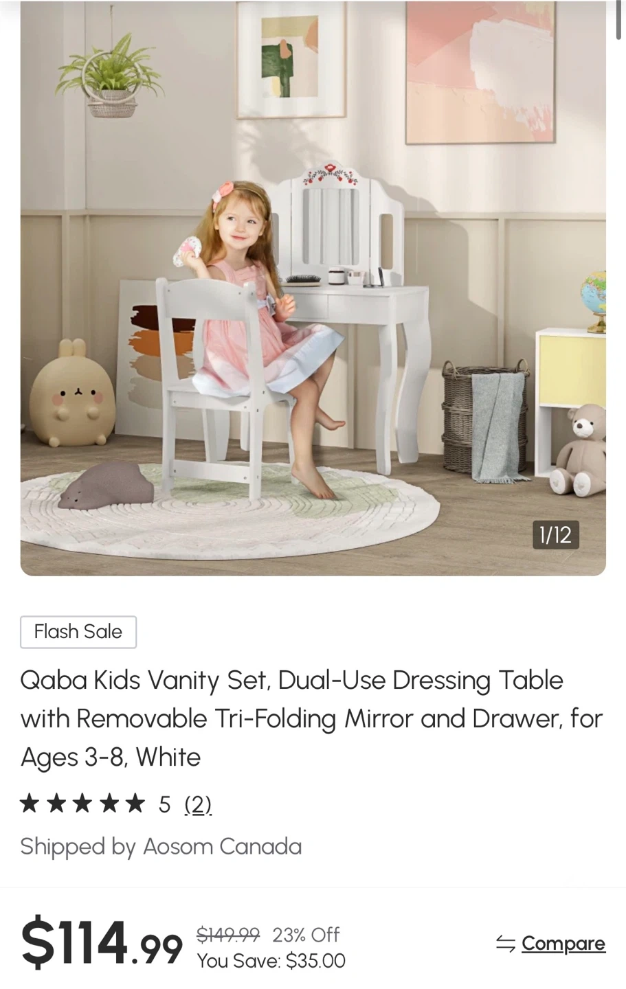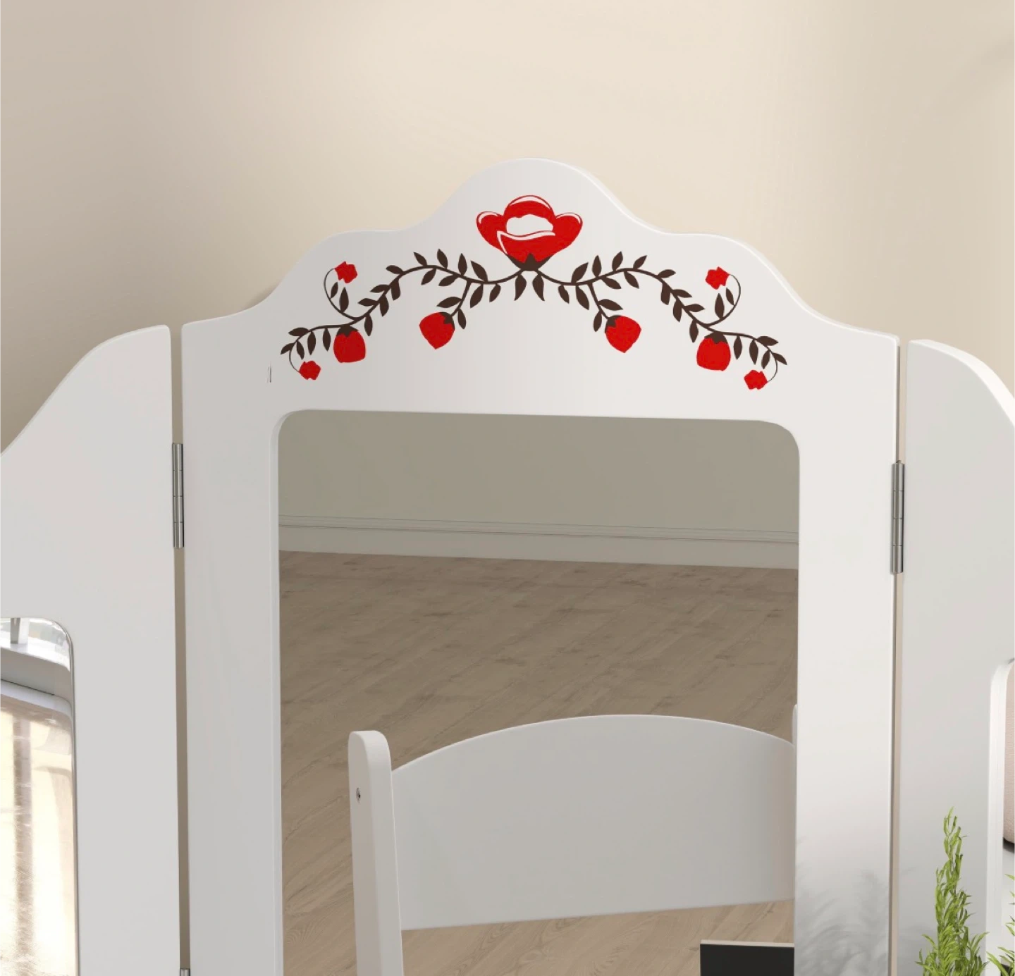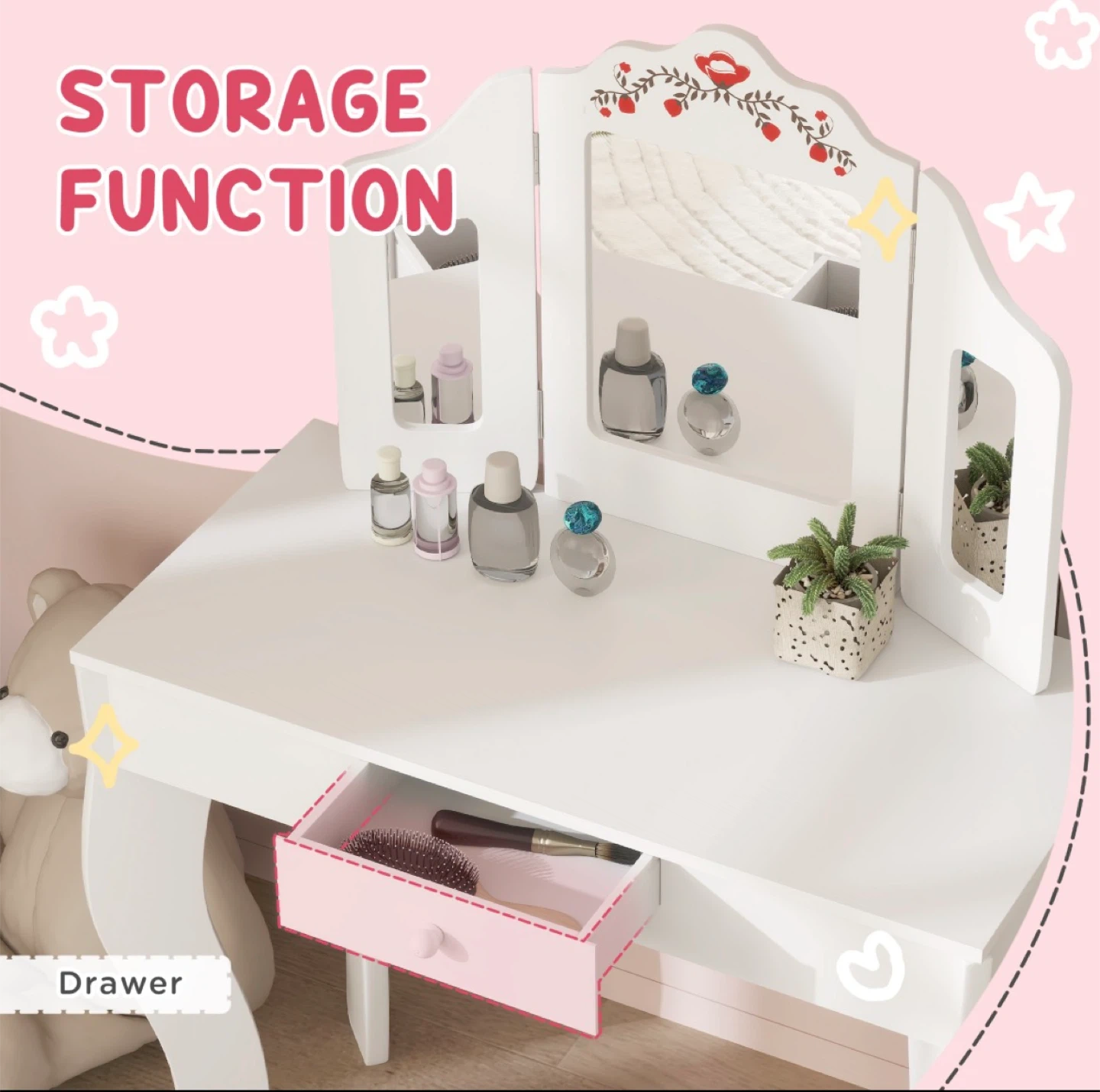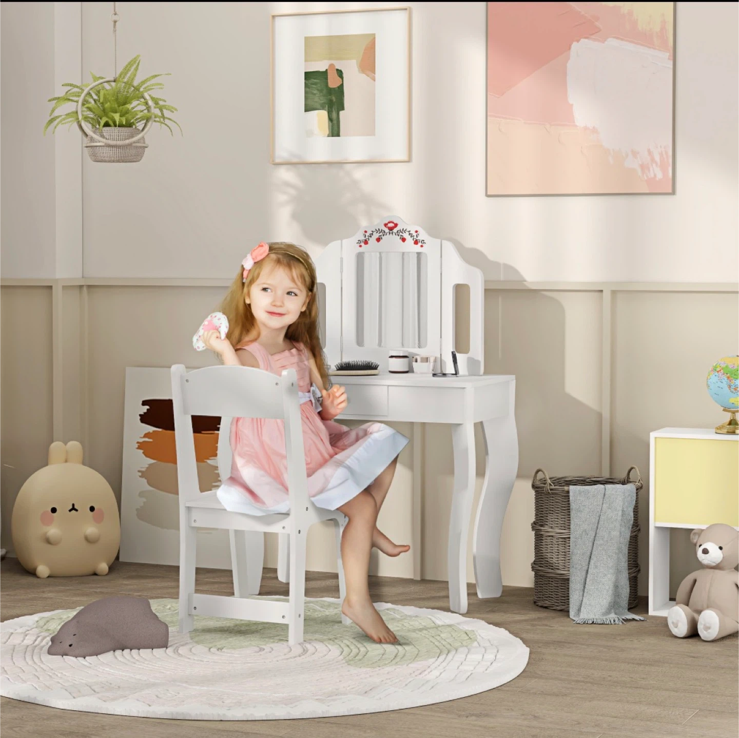 Brand New!! Vanity set is designed for kids aged 3-8. It's a dual-use dressing table with a removable tri-folding mirror. The set includes a drawer for storage. It's white with floral decorative accents on the mirror frame.