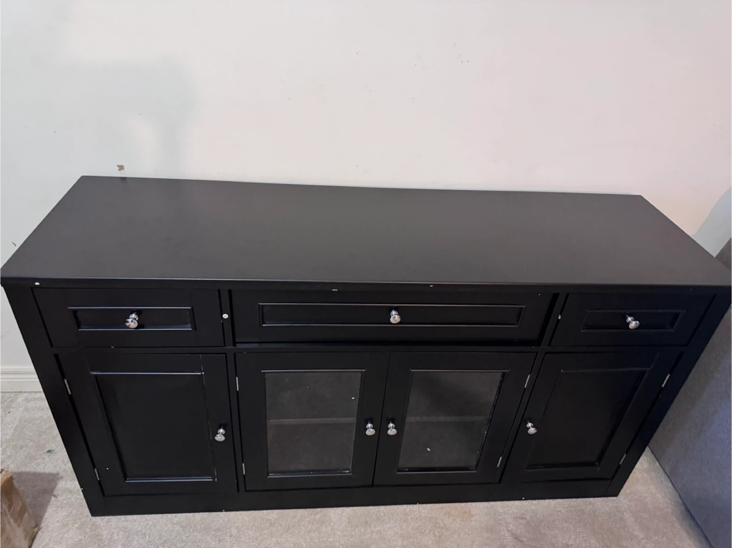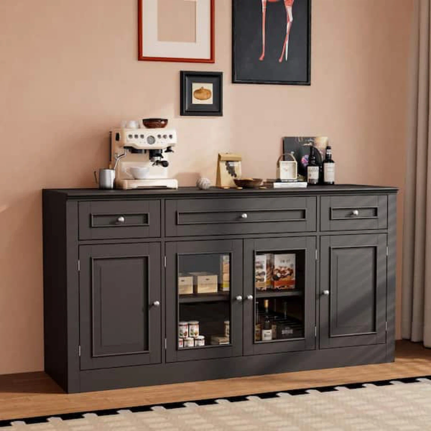 This black media console cabinet features multiple drawers and doors with glass panels. It offers ample storage space for your media components and decorative items. It's a stylish addition to any living room or entertainment area!