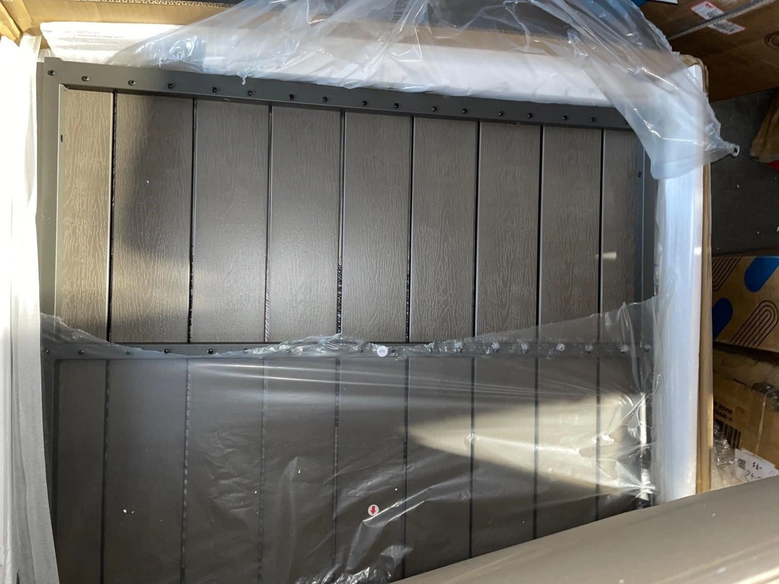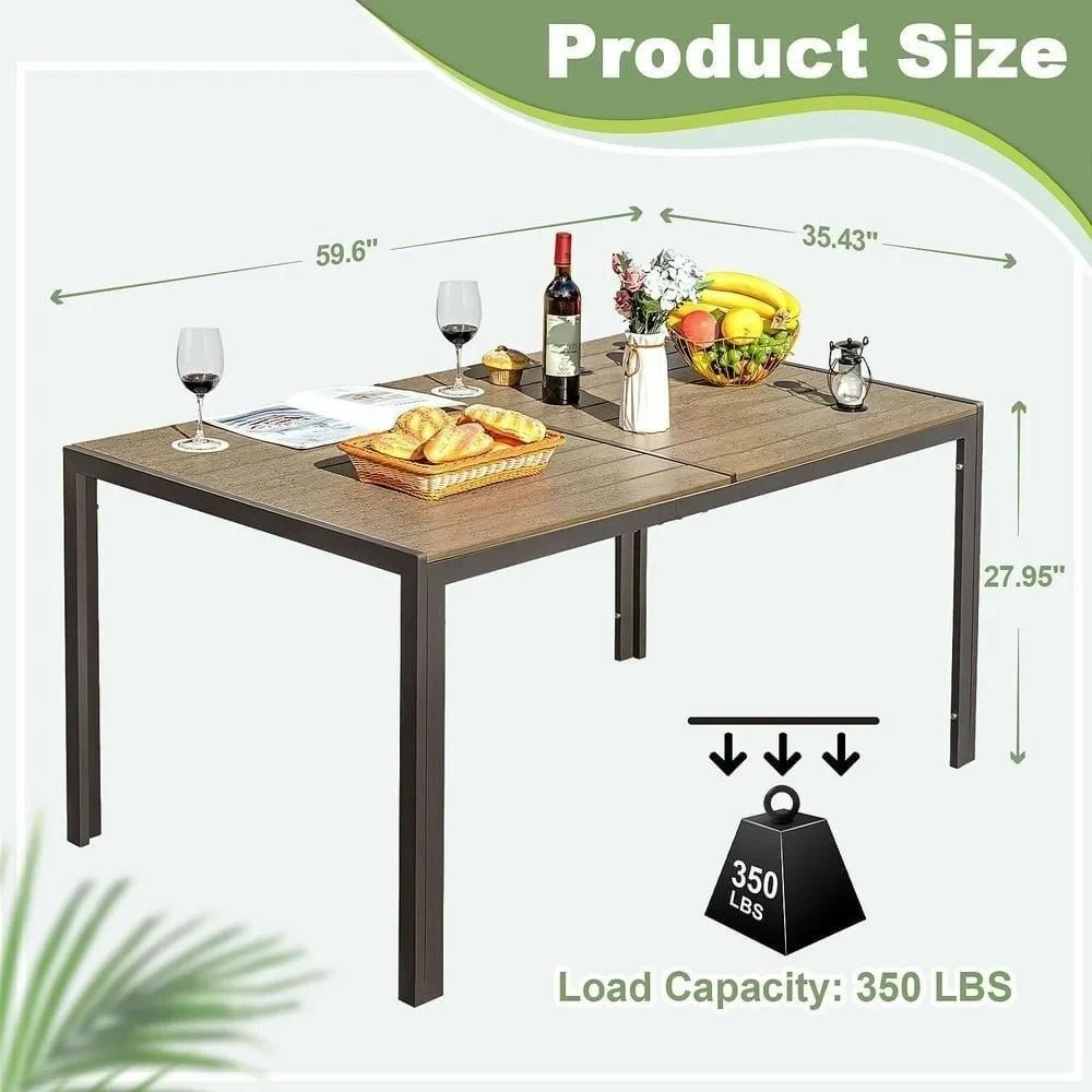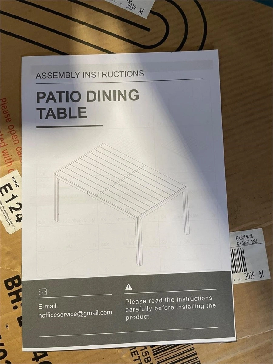 Selling a brand new patio dining table! The plastic table top features water and weather resistance, perfect for outdoor use. Assembly instructions are included, along with all the necessary components like screws and other hardware. Enjoy your outdoor dining experience with this durable and stylish table