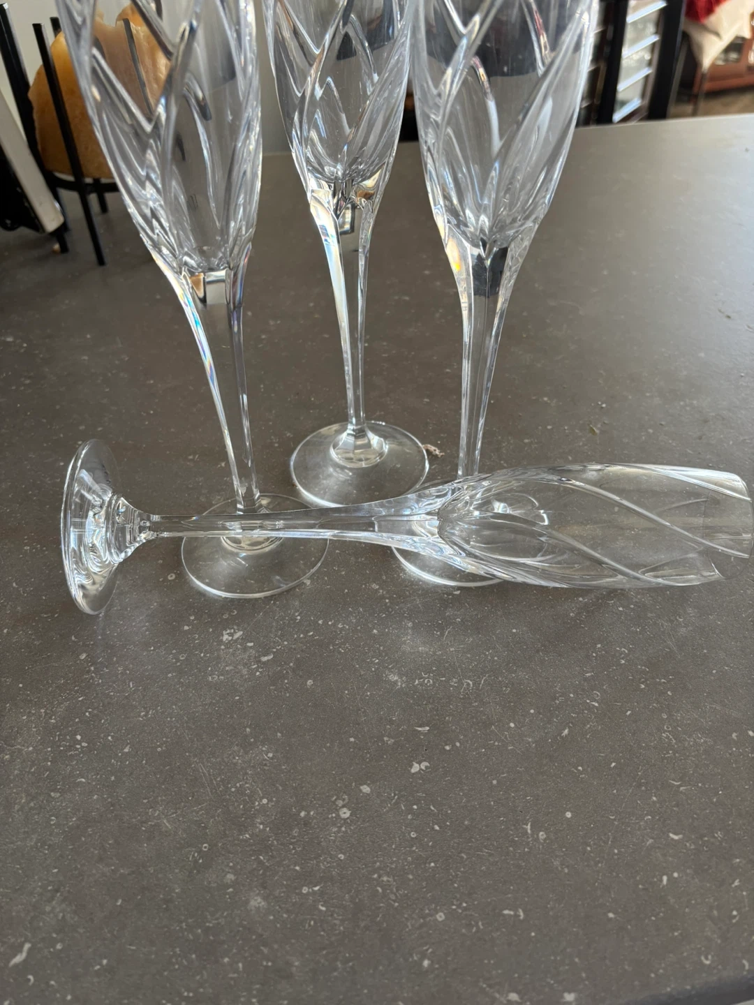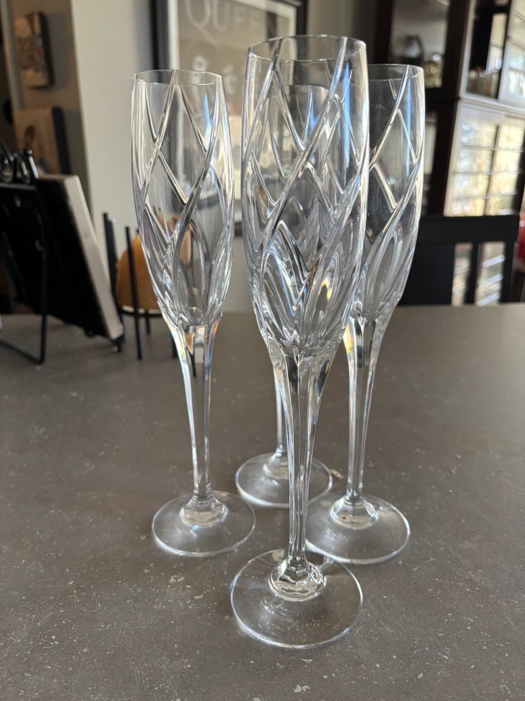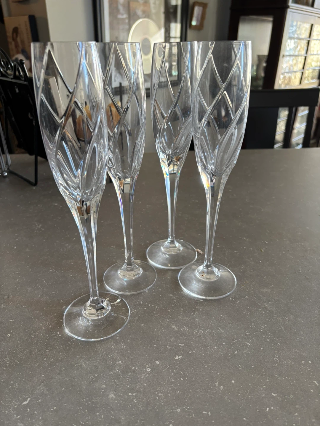 A set of four clear crystal Mikasa champagne flutes. They feature an intricate diamond and leaf pattern etched into the glass bowls and stems. These elegant glasses are perfect for celebrations or special occasions!