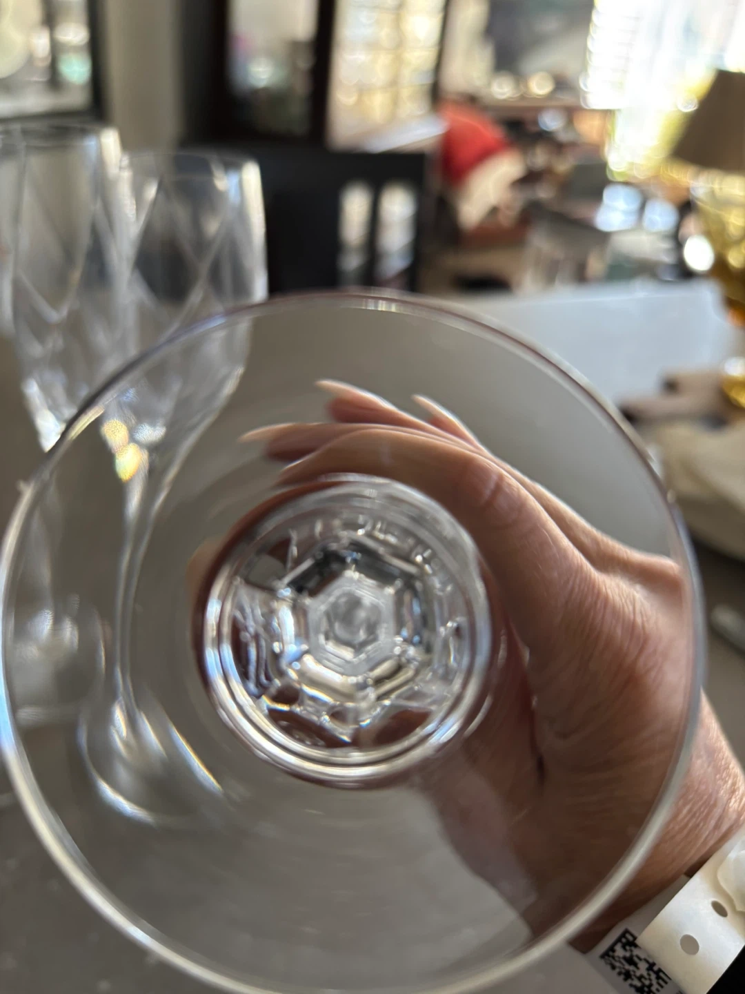 A set of four clear crystal Mikasa champagne flutes. They feature an intricate diamond and leaf pattern etched into the glass bowls and stems. These elegant glasses are perfect for celebrations or special occasions!