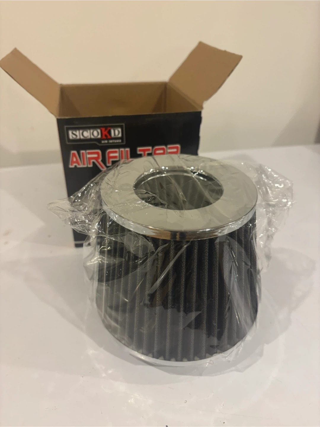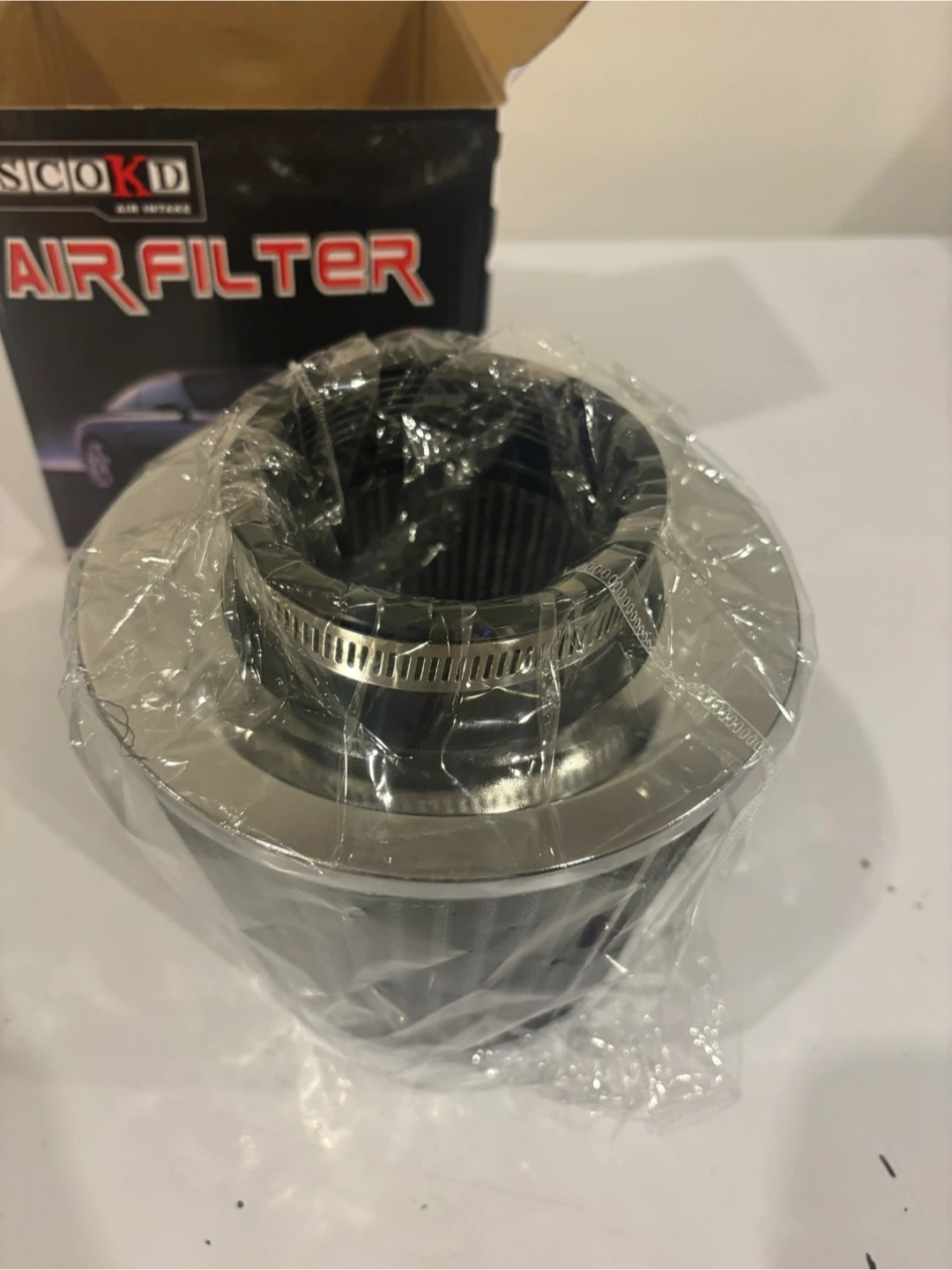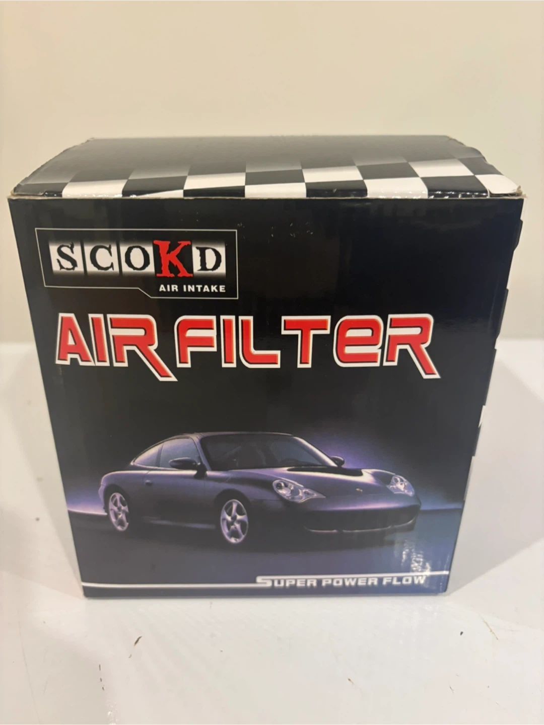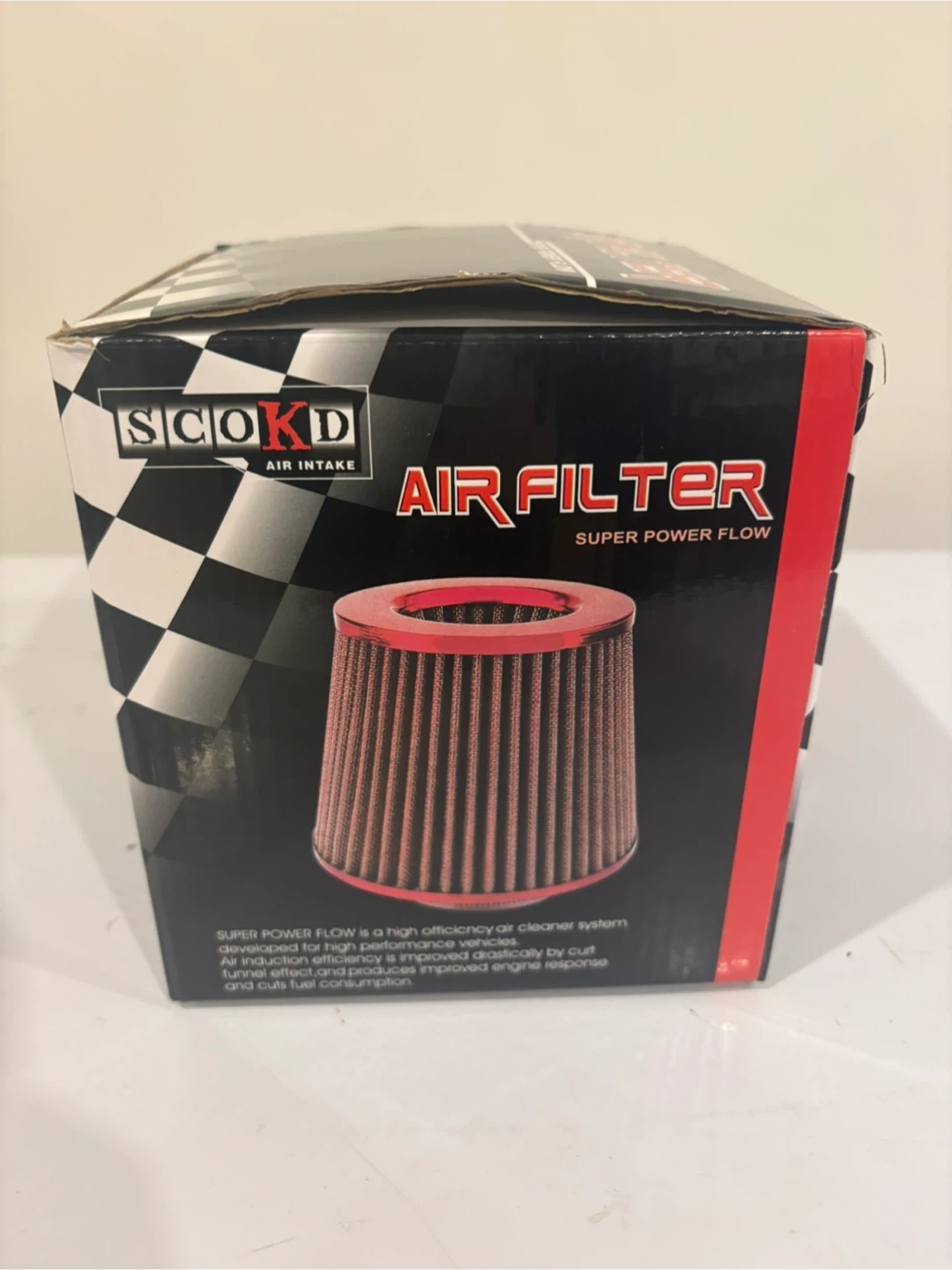 SCOKD air filter for improved engine response. Super power flow is a high efficiency air cleaner system. Air induction efficiency is improved by cut. This filter cuts fuel consumption. Includes clamp.