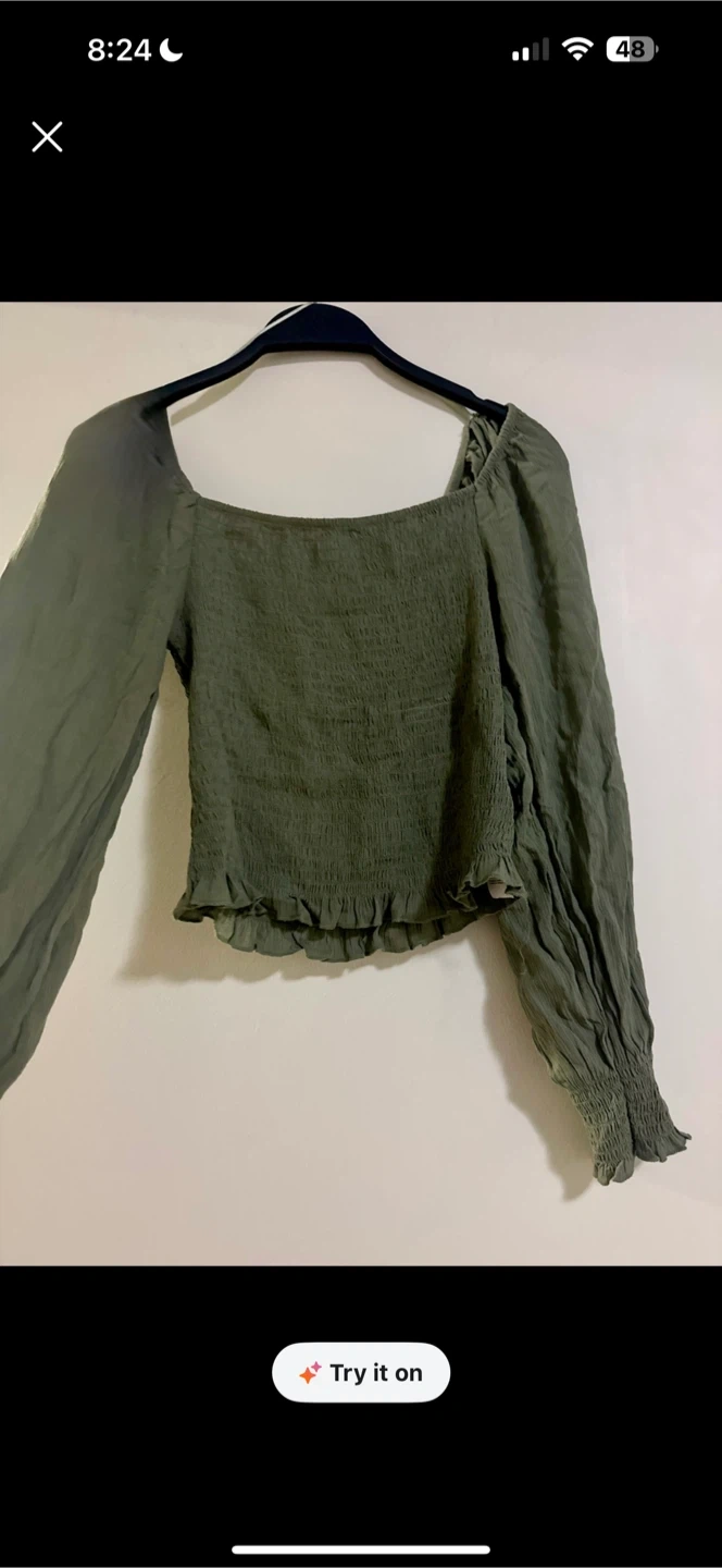 This olive green top features a smocked bodice and a square neckline. It has long, billowy sleeves with elasticized cuffs and a ruffled hem. It's a stylish piece for any wardrobe!