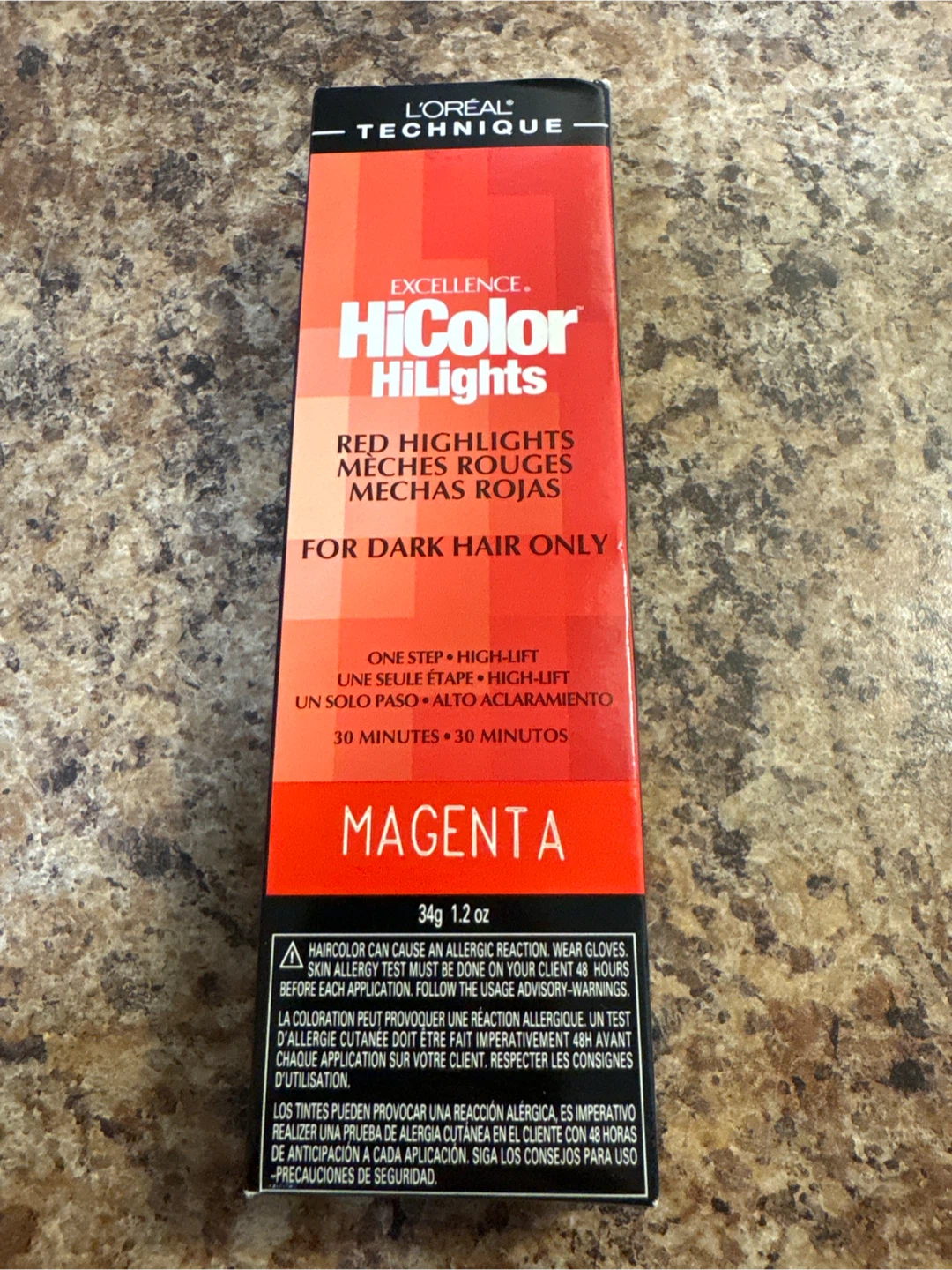 L'Oréal Technique HiColor HiLights hair colour in Magenta. This is for dark hair and provides red highlights. It's a one-step, high-lift formula. The size is 34g or 1.2 oz.
