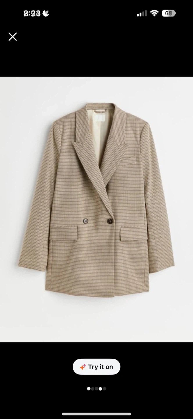 This is a stylish two-piece set from H&M, featuring a houndstooth pattern blazer and a matching skirt. It's a great option for work or a smart casual occasion. The blazer is double-breasted with a classic lapel. The skirt is a mini length.