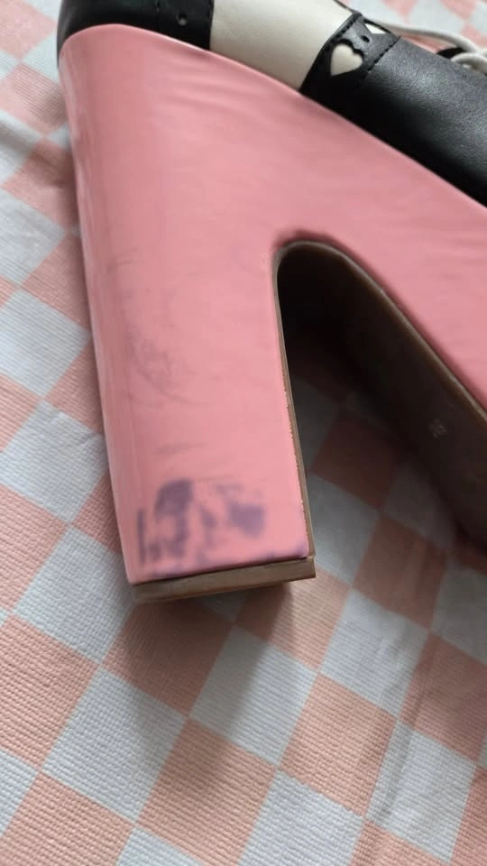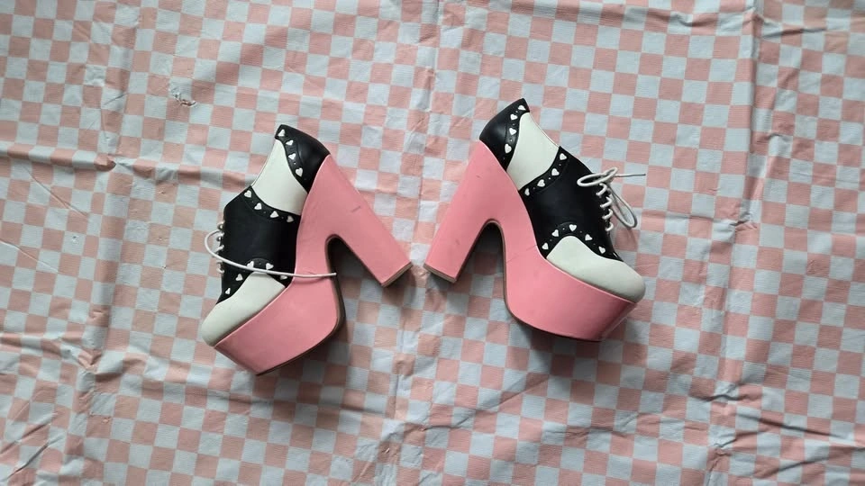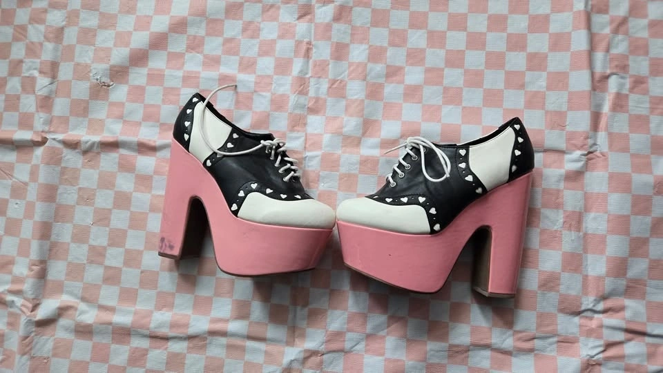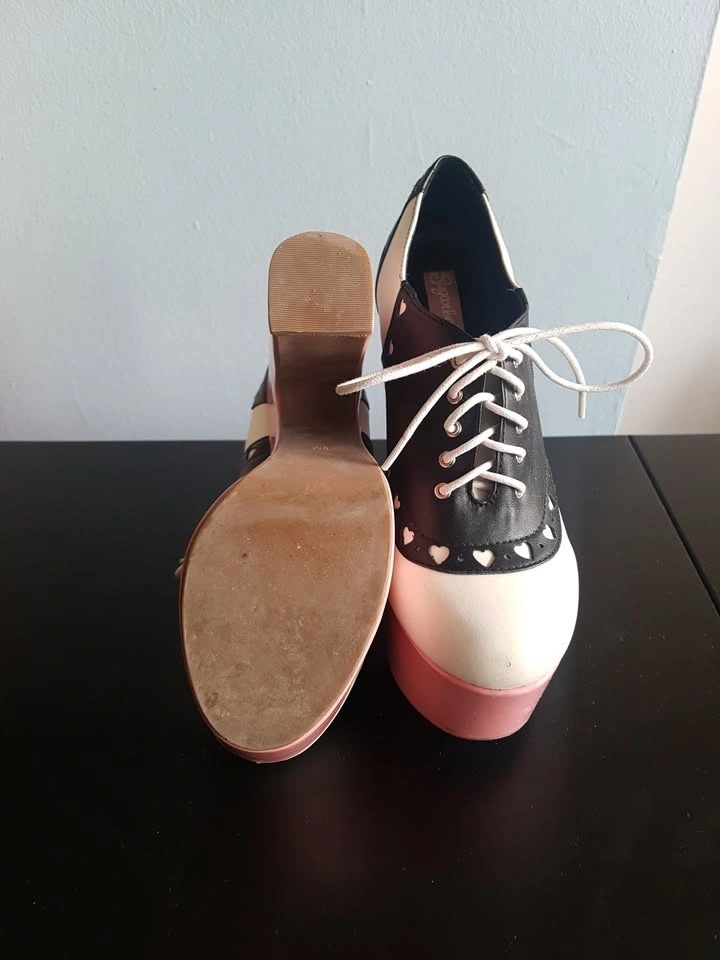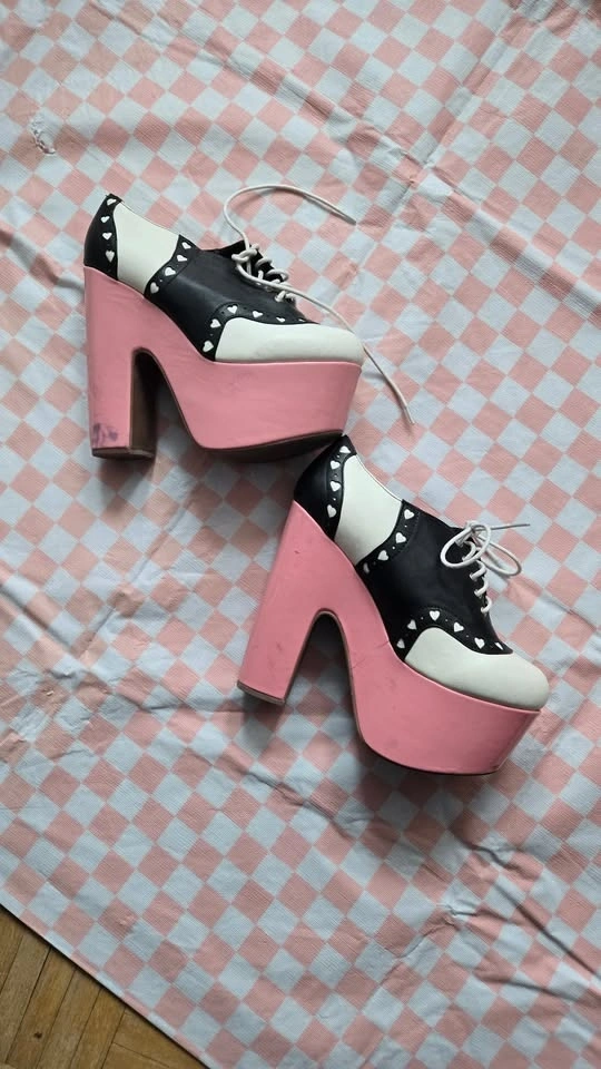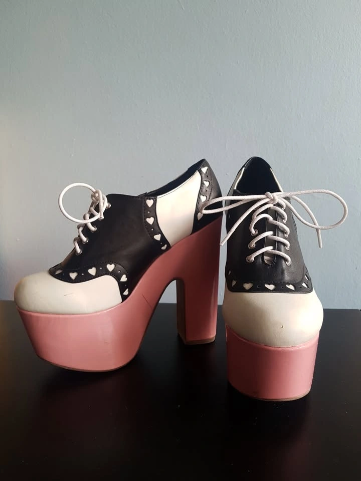 Oxford style with lace up and heart details. Vegan leather, with platform and heel in a patent pink. US size 8. 6” heel, 2.5" platform. Some scuffs on toe, light wear on sole (worn twice), some discoloration on heel from age/storage. Pick up Queen and John.