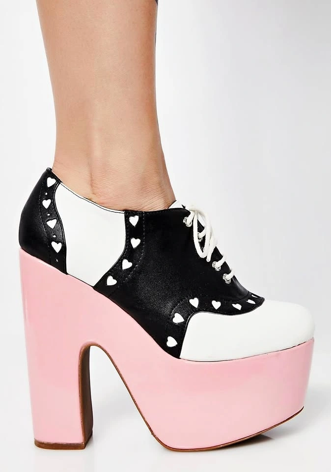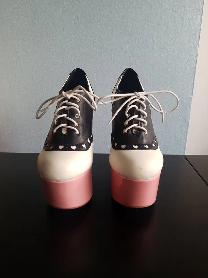Oxford style with lace up and heart details. Vegan leather, with platform and heel in a patent pink. US size 8. 6” heel, 2.5" platform. Some scuffs on toe, light wear on sole (worn twice), some discoloration on heel from age/storage. Pick up Queen and John.