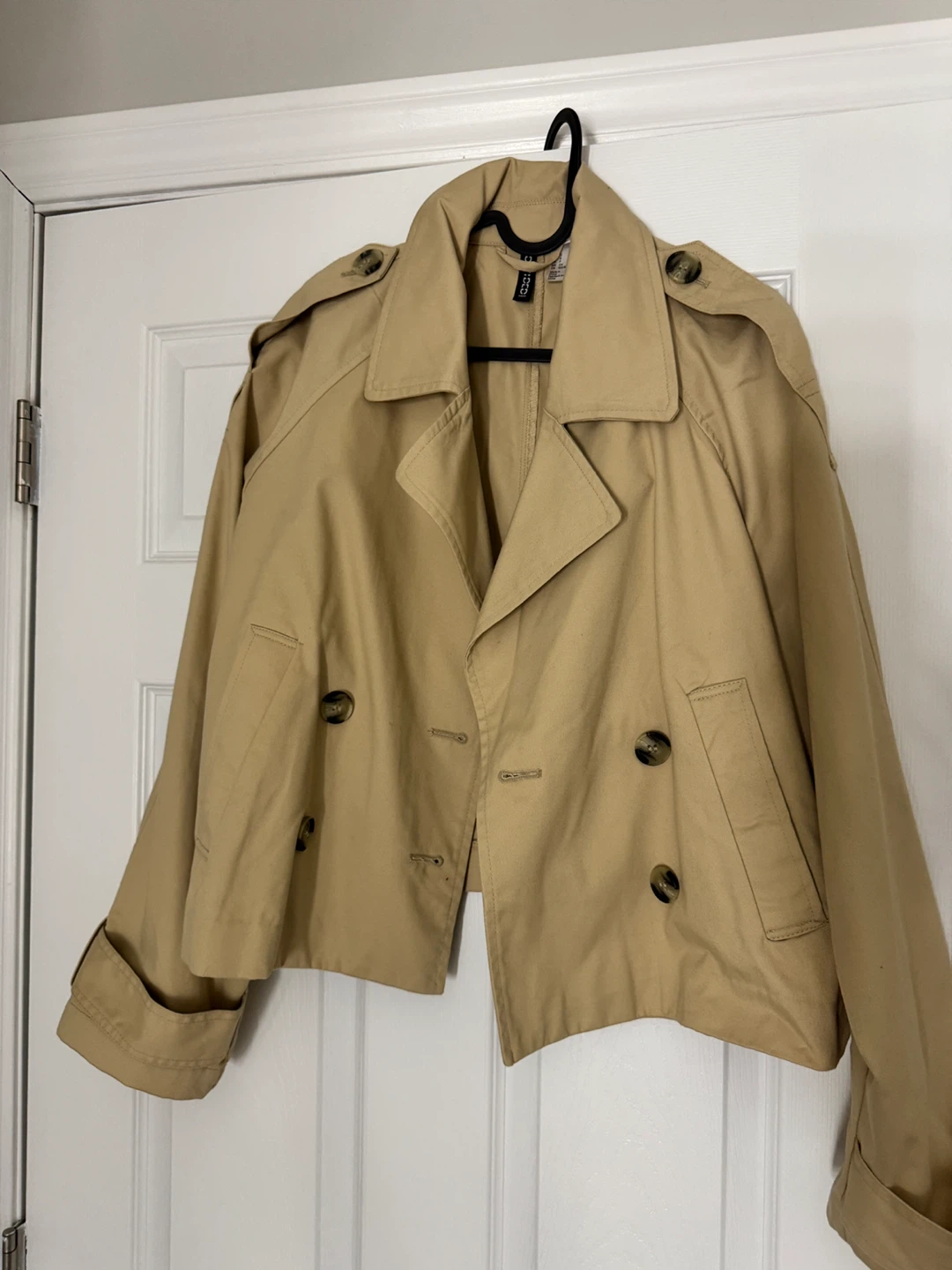 This is a tan cropped trench coat from H&M. It's double-breasted with button closures. Made from a cotton blend material. A stylish layer for any outfit!