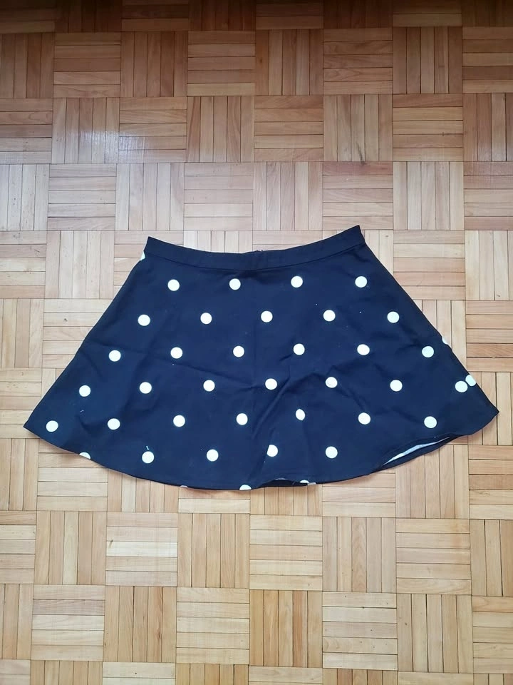 Denim black and white polkadot circle skater skirt. US 8 / EU 38. Length 15”, waist 31”. 6" zip. Bundle and save! Pick up at Queen and John.