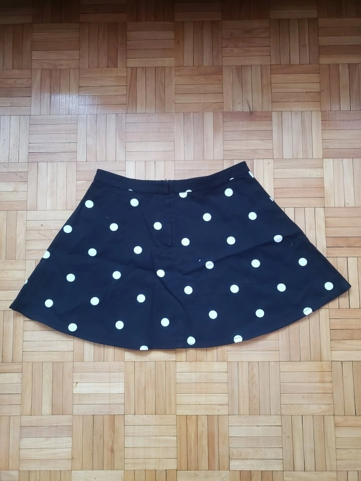 Denim black and white polkadot circle skater skirt. US 8 / EU 38. Length 15”, waist 31”. 6" zip. Bundle and save! Pick up at Queen and John.